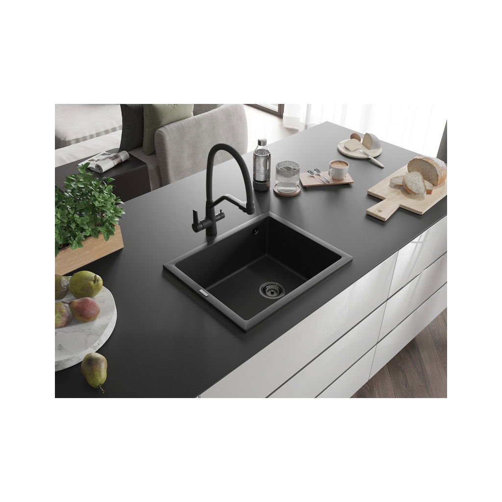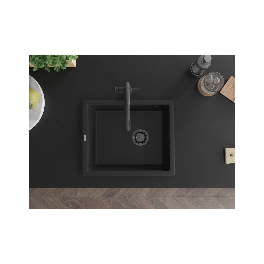 Mexen Pedro, granitový dřez 560x460x200 mm, 1-komorový, černá s černým sifonem, 6508561000-77-B