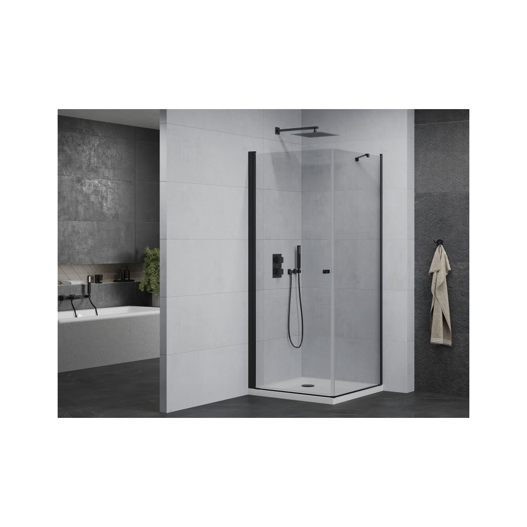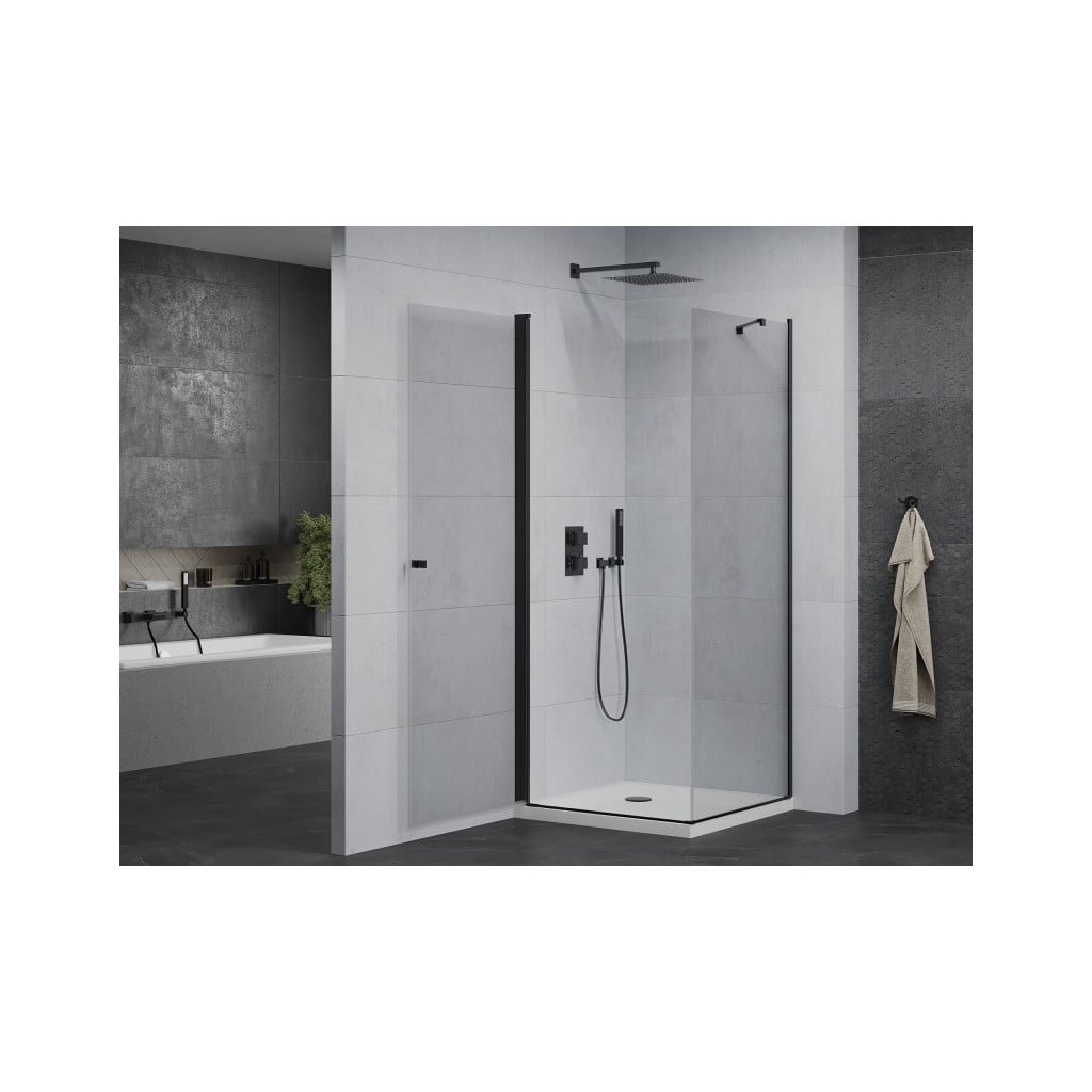 Elegantní sprchový kout je vyroben ze 6 mm silného tvrzeného skla v průchodu procedury. Aplikovaná povrchová úprava skla zajišťuje maximální komfort všem uživatelům. Tato technologie zaručuje jedinečné vlastnosti, aby se zabránilo kontaminaci skla – povrch stačí jen opláchnout vodou. Kout je osazen v černých hliníkových profilech a je vybaven těsněním, které zabraňuje úniku vody mimo sprchu kout. Dveře sprchového koutu jsou křídlové s možností otevírání dovnitř nebo ven (nutno zvolit při montáži). K otevírání slouží decentní kovová rukojeť. Dokonalou stabilitu sprchového koutu zajišťuje kotvící rameno, které je součástí produktu. Sprchový kout je univerzální – při instalaci se rozhodnete otevřít vpravo nebo doleva. Profilové lišty umožňují regulaci pro vyrovnání případných drobných nerovností stěn. Sprchový kout lze instalovat na sprchovou vaničku nebo přímo na dlažbu.