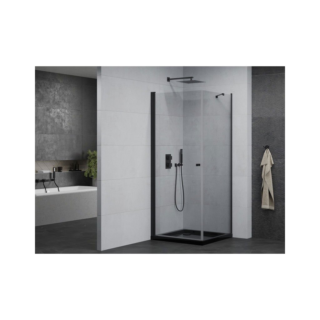 Elegantní sprchový kout je vyroben ze 6 mm silného tvrzeného skla v průchodu procedury. Aplikovaná povrchová úprava skla zajišťuje maximální komfort všem uživatelům. Tato technologie zaručuje jedinečné vlastnosti, aby se zabránilo kontaminaci skla – povrch stačí jen opláchnout vodou. Kout je osazen v černých hliníkových profilech a je vybaven těsněním, které zabraňuje úniku vody mimo sprchu kout. Dveře sprchového koutu jsou křídlové s možností otevírání dovnitř nebo ven (nutno zvolit při montáži). K otevírání slouží decentní kovová rukojeť. Dokonalou stabilitu sprchového koutu zajišťuje kotvící rameno, které je součástí produktu. Sprchový kout je univerzální – při instalaci se rozhodnete otevřít vpravo nebo doleva. Profilové lišty umožňují regulaci pro vyrovnání případných drobných nerovností stěn. Sprchový kout lze instalovat na sprchovou vaničku nebo přímo na dlažbu.