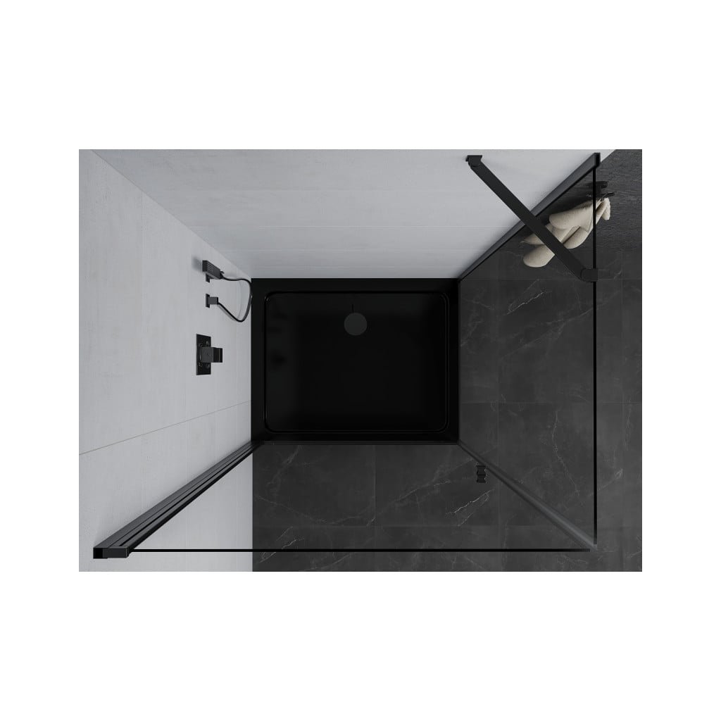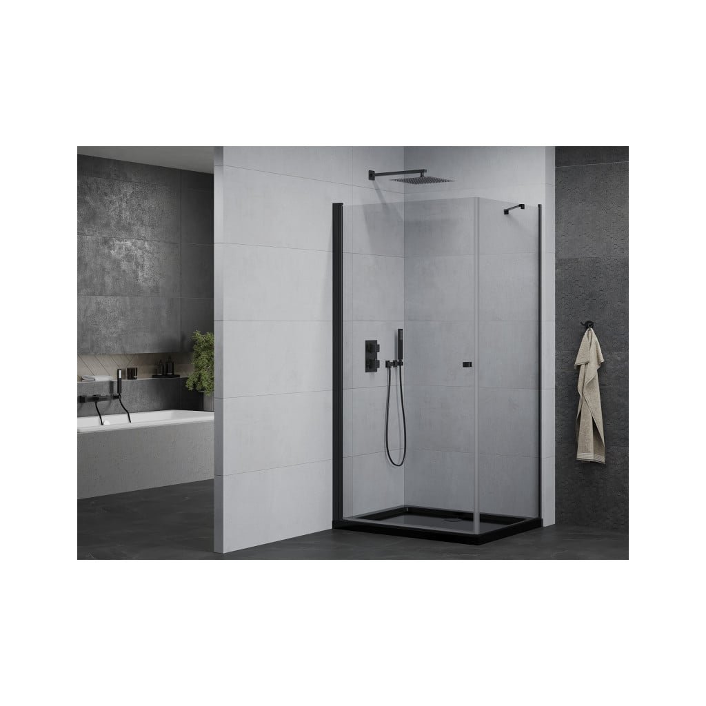 Elegantní sprchový kout je vyroben ze 6 mm silného tvrzeného skla v průchodu procedury. Aplikovaná povrchová úprava skla zajišťuje maximální komfort všem uživatelům. Tato technologie zaručuje jedinečné vlastnosti, aby se zabránilo kontaminaci skla – povrch stačí jen opláchnout vodou. Kout je osazen v černých hliníkových profilech a je vybaven těsněním, které zabraňuje úniku vody mimo sprchu kout. Dveře sprchového koutu jsou křídlové s možností otevírání dovnitř nebo ven (nutno zvolit při montáži). K otevírání slouží decentní kovová rukojeť. Dokonalou stabilitu sprchového koutu zajišťuje kotvící rameno, které je součástí produktu. Sprchový kout je univerzální – při instalaci se rozhodnete otevřít vpravo nebo doleva. Profilové lišty umožňují regulaci pro vyrovnání případných drobných nerovností stěn. Sprchový kout lze instalovat na sprchovou vaničku nebo přímo na dlažbu.