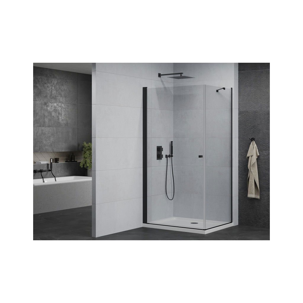 Elegantní sprchový kout je vyroben ze 6 mm silného tvrzeného skla v průchodu procedury. Aplikovaná povrchová úprava skla zajišťuje maximální komfort všem uživatelům. Tato technologie zaručuje jedinečné vlastnosti, aby se zabránilo kontaminaci skla – povrch stačí jen opláchnout vodou. Kout je osazen v černých hliníkových profilech a je vybaven těsněním, které zabraňuje úniku vody mimo sprchu kout. Dveře sprchového koutu jsou křídlové s možností otevírání dovnitř nebo ven (nutno zvolit při montáži). K otevírání slouží decentní kovová rukojeť. Dokonalou stabilitu sprchového koutu zajišťuje kotvící rameno, které je součástí produktu. Sprchový kout je univerzální – při instalaci se rozhodnete otevřít vpravo nebo doleva. Profilové lišty umožňují regulaci pro vyrovnání případných drobných nerovností stěn. Sprchový kout lze instalovat na sprchovou vaničku nebo přímo na dlažbu.