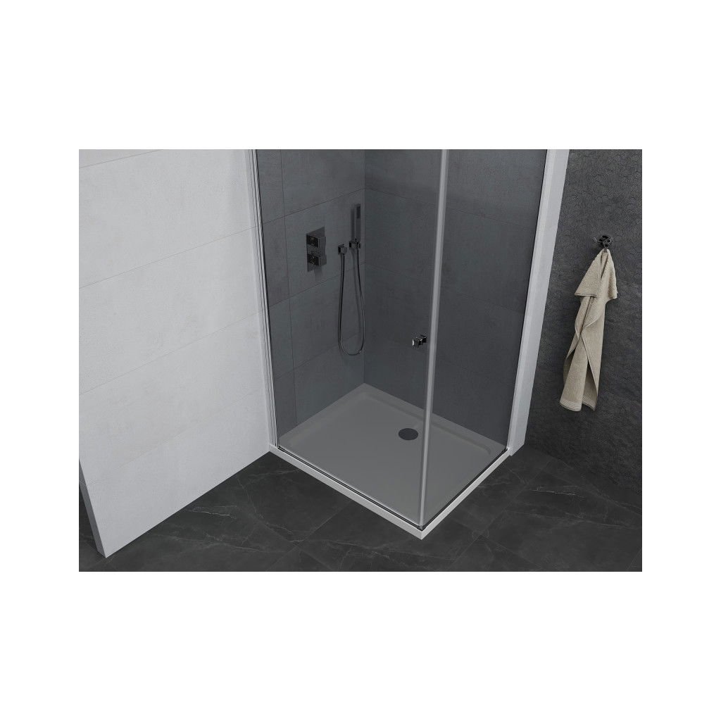 Elegantní sprchový kout je vyroben ze 6 mm silného tvrzeného šedého skla v průchodu procedury. Aplikovaná povrchová úprava skla zajišťuje maximální komfort všem uživatelům. Tato technologie zaručuje jedinečné vlastnosti, aby se zabránilo kontaminaci skla – povrch stačí jen opláchnout vodou. Kout je osazen v chromových hliníkových profilech a je vybaven těsněním, které zabraňuje úniku vody mimo sprchu kout. Dveře sprchového koutu jsou křídlové s možností otevírání dovnitř nebo ven (nutno zvolit při montáži). K otevírání slouží decentní kovová rukojeť. Dokonalou stabilitu sprchového koutu zajišťuje kotvící rameno, které je součástí produktu. Sprchový kout je univerzální – při instalaci se rozhodnete otevřít vpravo nebo doleva. Profilové lišty umožňují regulaci pro vyrovnání případných drobných nerovností stěn. Sprchový kout lze instalovat na sprchovou vaničku nebo přímo na dlažbu.