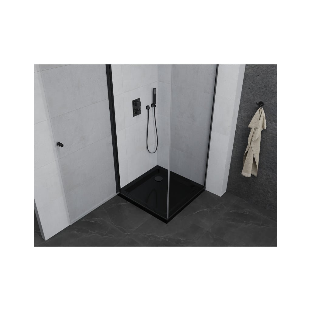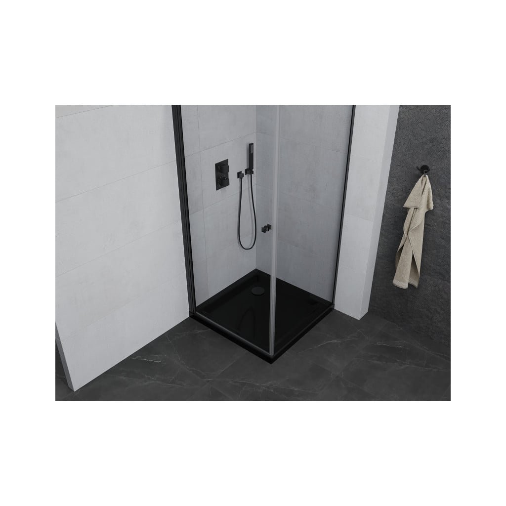 Mexen Pretoria, sprchový kout 90 (dveře) x 90 (stěna) cm, 6mm čiré sklo, černý profil + černá sprchová vanička, 852-090-090-70-00-4070B