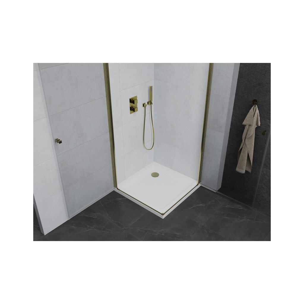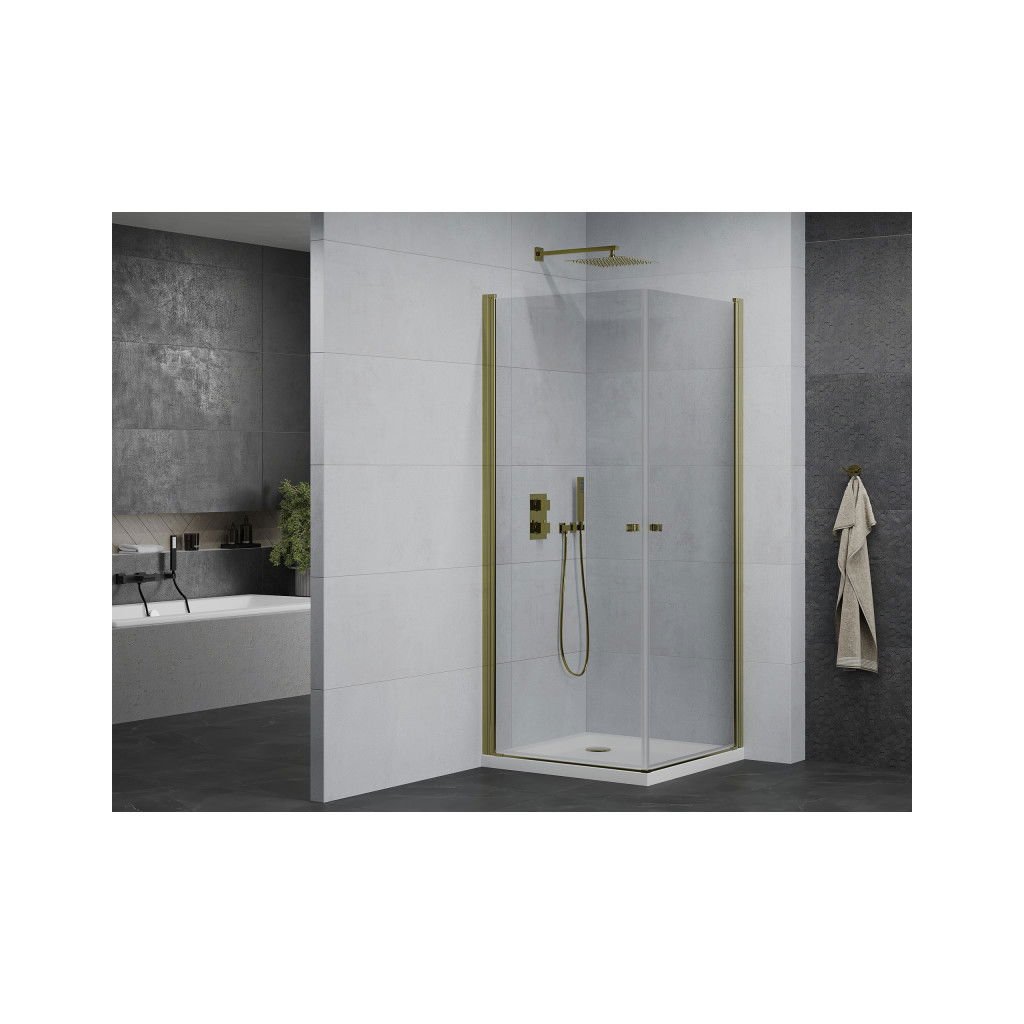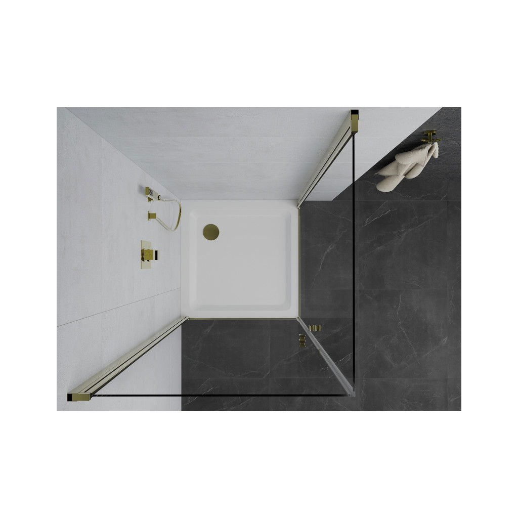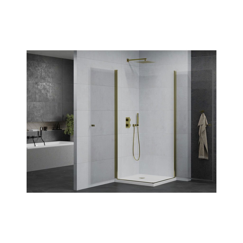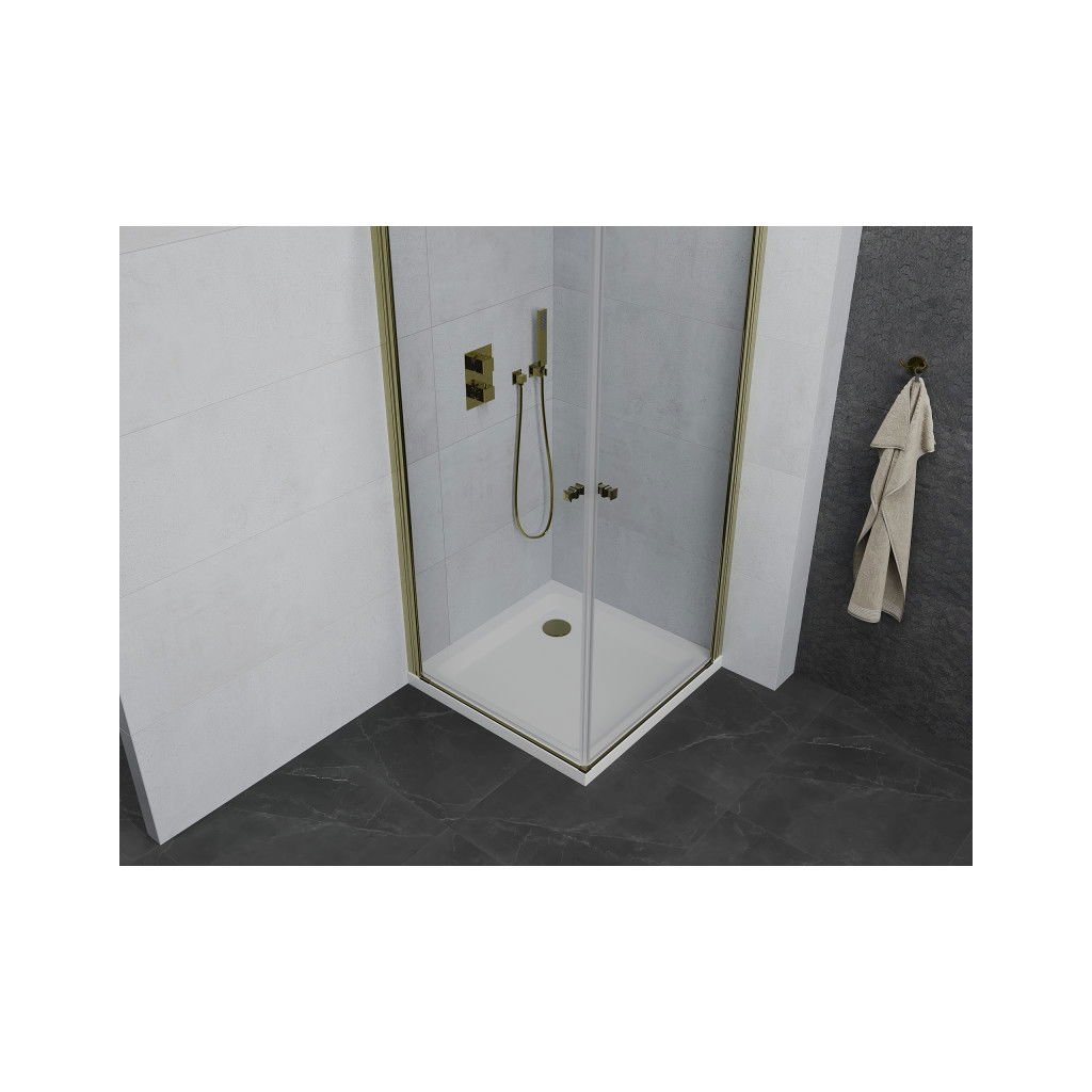 Mexen Pretoria Duo, sprchový kout se 2-křídlými dveřmi 90 (dveře) x 90 (dveře) cm, 6mm čiré sklo, zlatý profil + sprchová vanička, 852-090-090-50-02-4010G