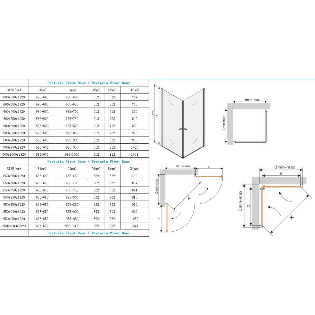 Technický list pro sprchové kouty Mexen Pretoria DUO (2-křídlé otevírání):