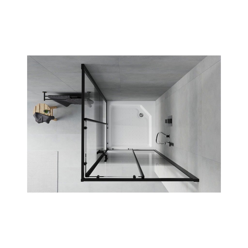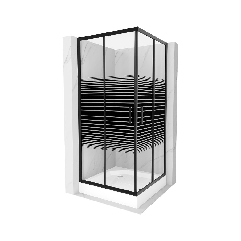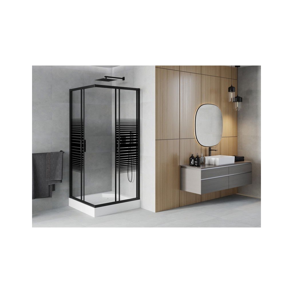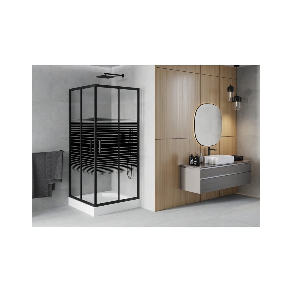 Mexen Rio, čtvercový sprchový kout 90(dveře)x90(dveře)x190 cm, 5mm čiré sklo-vzor pásky, černý profil + bílá sprchová vanička RIO, 860-090-090-70-20-4510