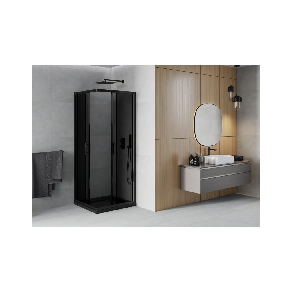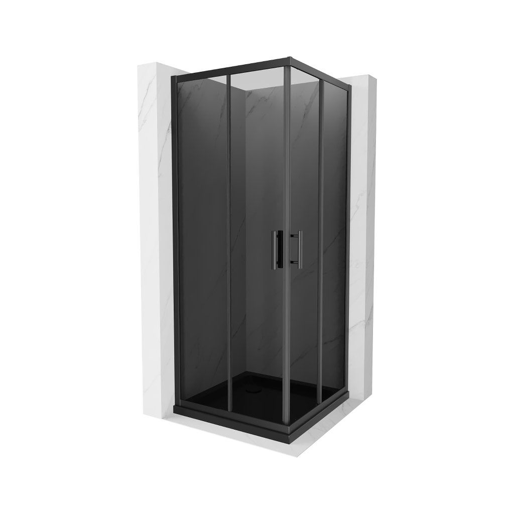 Mexen Rio, čtvercový sprchový kout 90(dveře)x90(dveře)x190 cm, 5mm šedé sklo, černý profil + černá sprchová vanička SLIM, 860-090-090-70-40-4070B