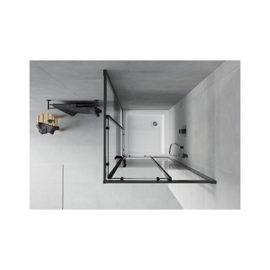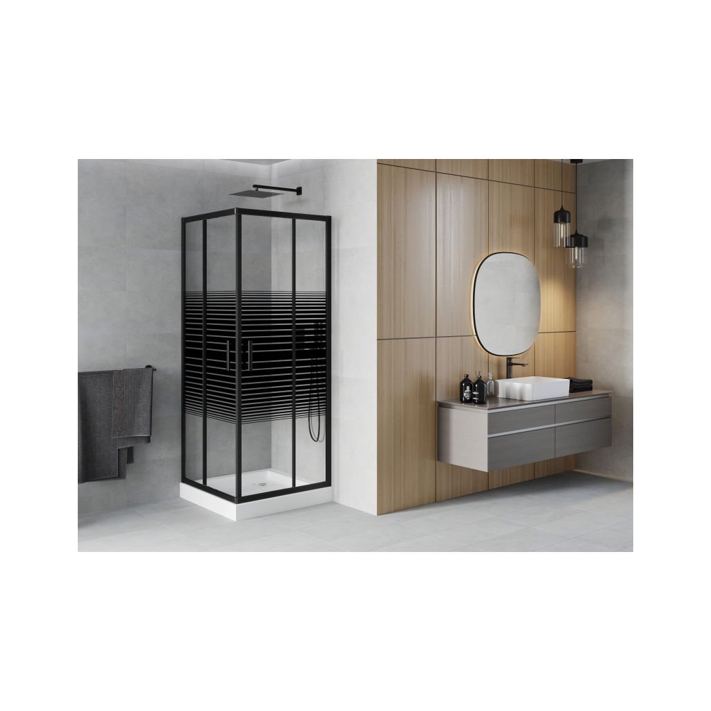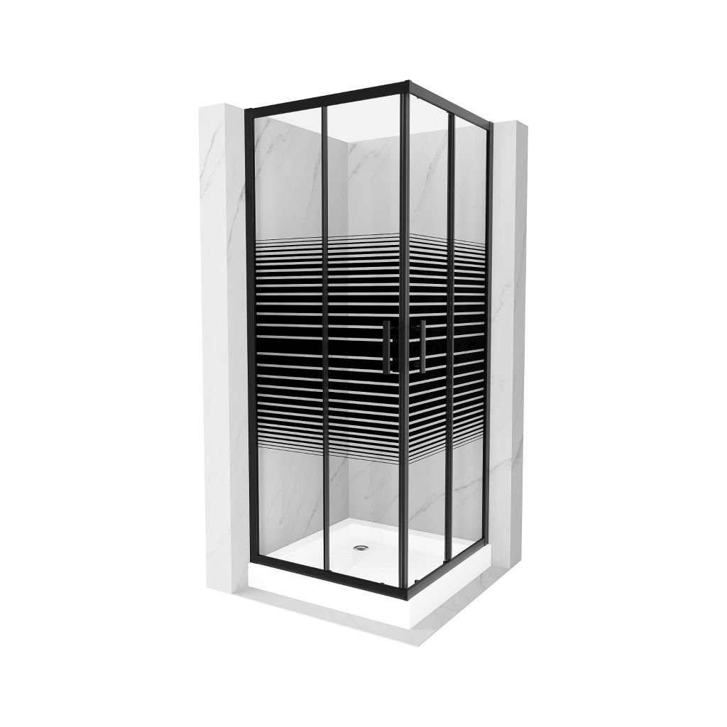 Mexen Rio, čtvercový sprchový kout s posuvnými dveřmi 70 (dveře) x 70 (dveře) x 190 cm, 5mm čiré sklo s pásky, černý profil + bílá sprchová vanička RIO, 860-070-070-70-20-4510