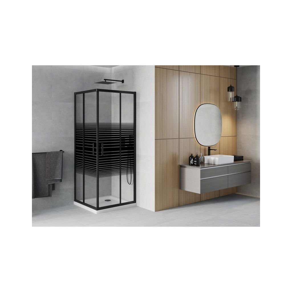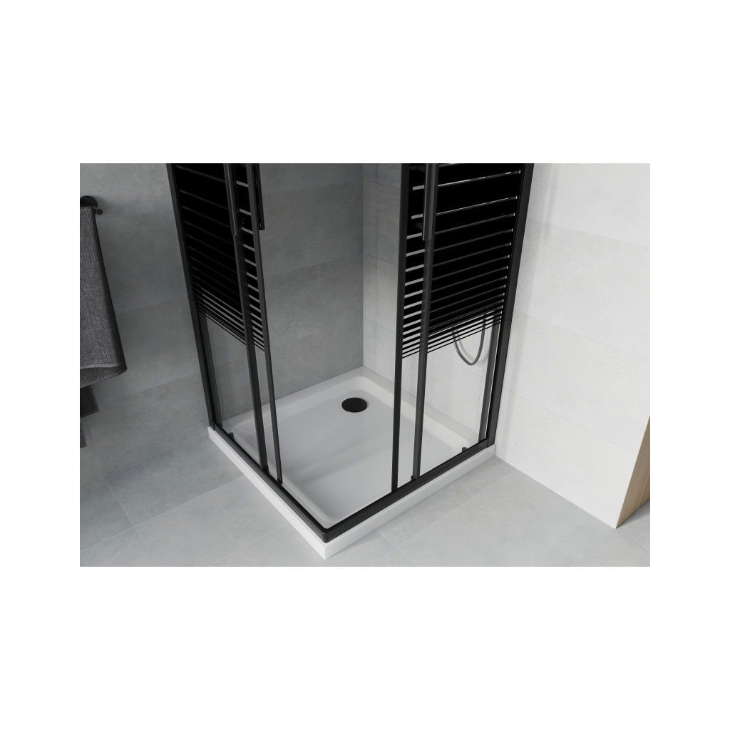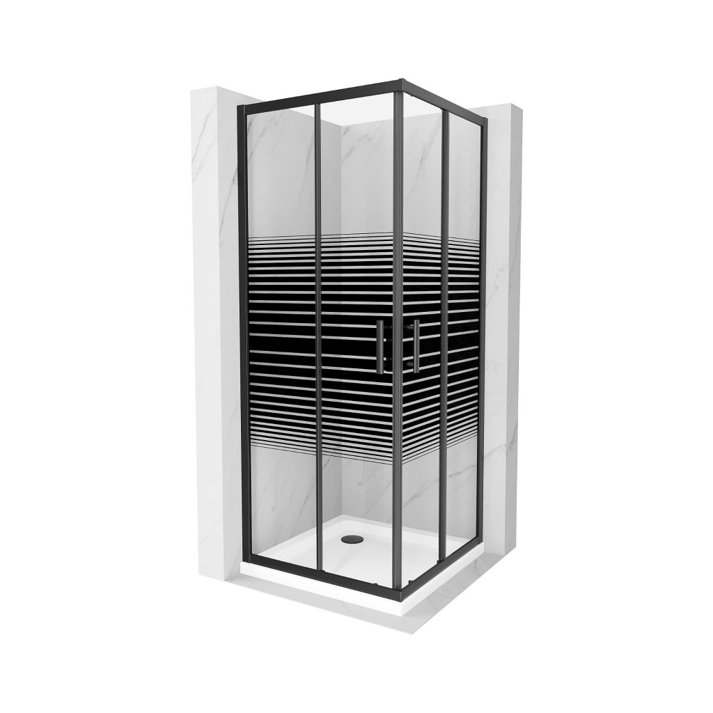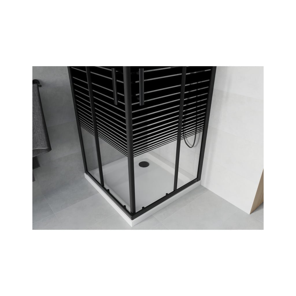 Mexen Rio, čtvercový sprchový kout s posuvnými dveřmi 70 (dveře) x 70 (dveře) x 190 cm, 5mm čiré sklo s pásky, černý profil + bílá sprchová vanička SLIM, 860-070-070-70-20-4010B