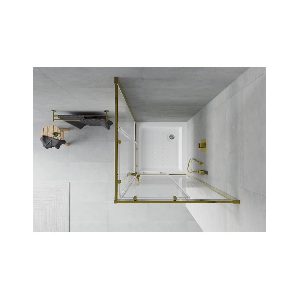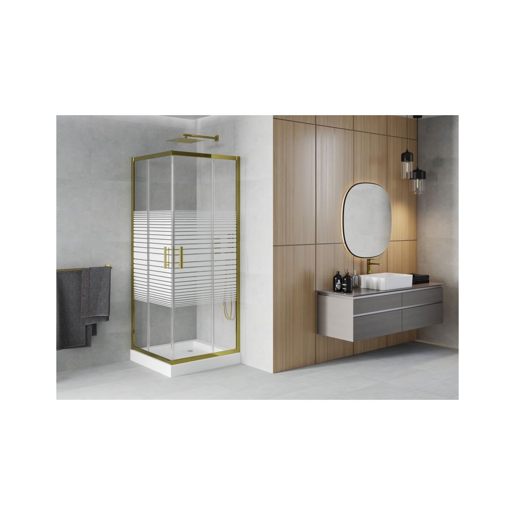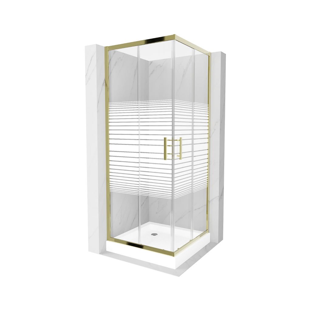 Mexen Rio, čtvercový sprchový kout s posuvnými dveřmi 70 (dveře) x 70 (dveře) x 190 cm, 5mm čiré sklo s pásky, zlatý profil + bílá sprchová vanička RIO, 860-070-070-50-20-4510