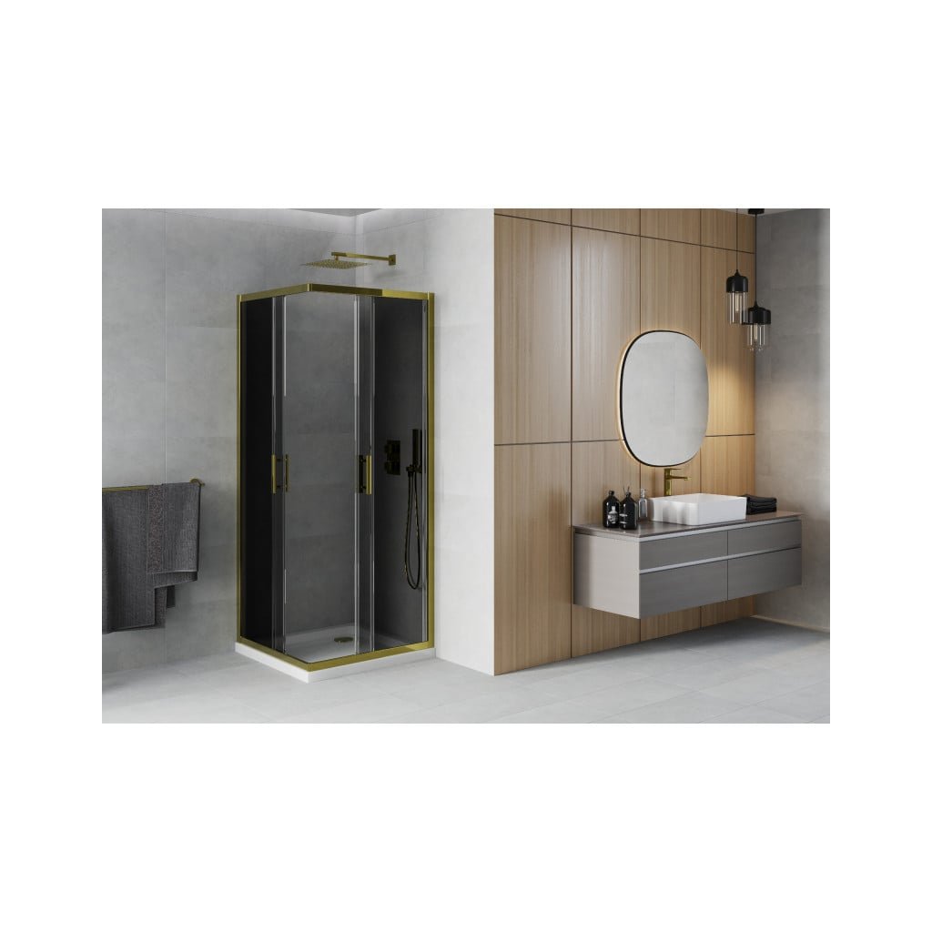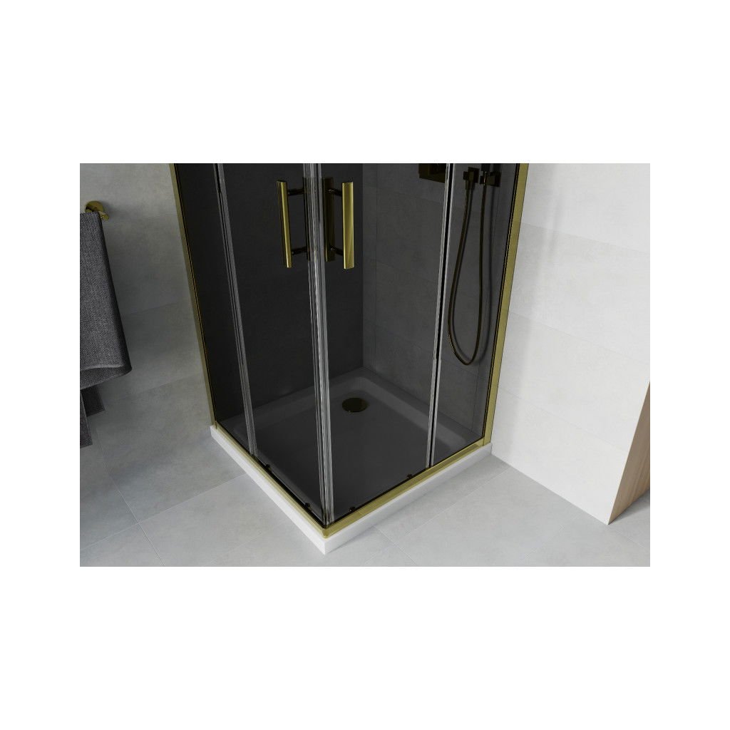 Mexen Rio, čtvercový sprchový kout s posuvnými dveřmi 70 (dveře) x 70 (dveře) x 190 cm, 5mm šedé sklo, zlatý profil + bílá sprchová vanička SLIM, 860-070-070-50-40-4010G