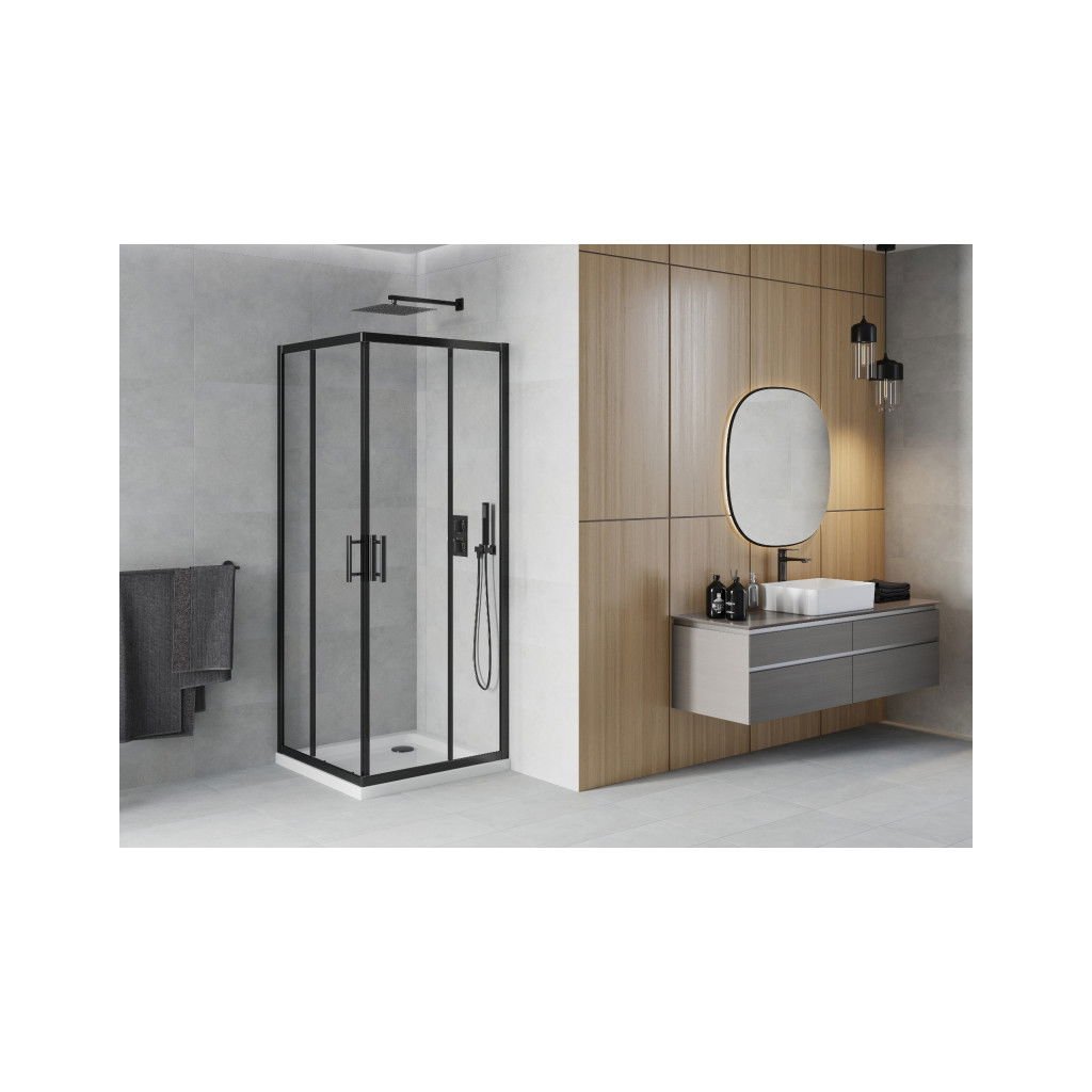 Mexen Rio, čtvercový sprchový kout s posuvnými dveřmi 80 (dveře) x 80 (dveře) x 190 cm, 5mm čiré sklo, černý profil + bílá sprchová vanička SLIM, 860-080-080-70-00-4010B