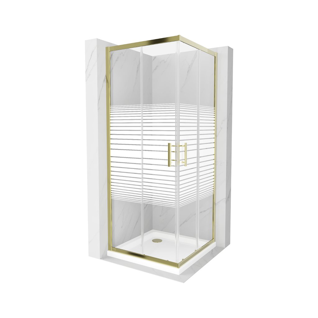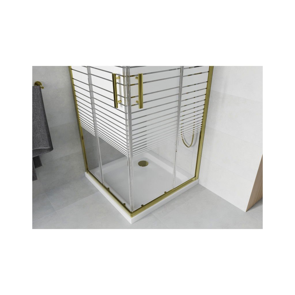 Mexen Rio, čtvercový sprchový kout s posuvnými dveřmi 80 (dveře) x 80 (dveře) x 190 cm, 5mm čiré sklo s pásky, zlatý profil + bílá sprchová vanička SLIM, 860-080-080-50-20-4010G