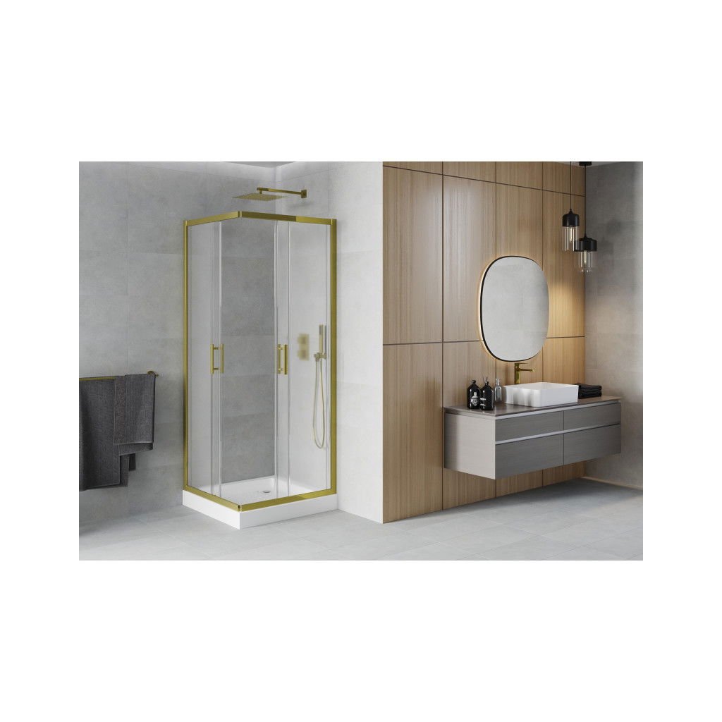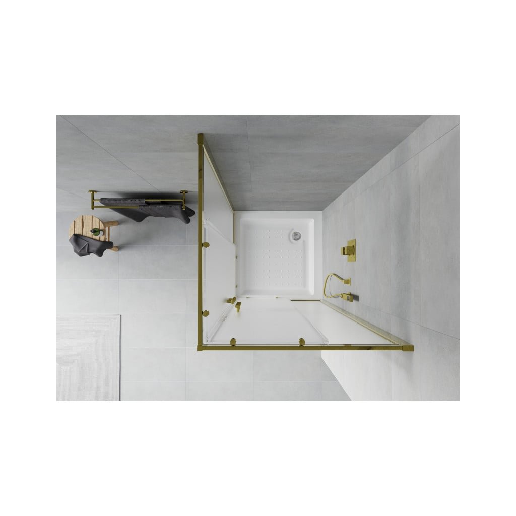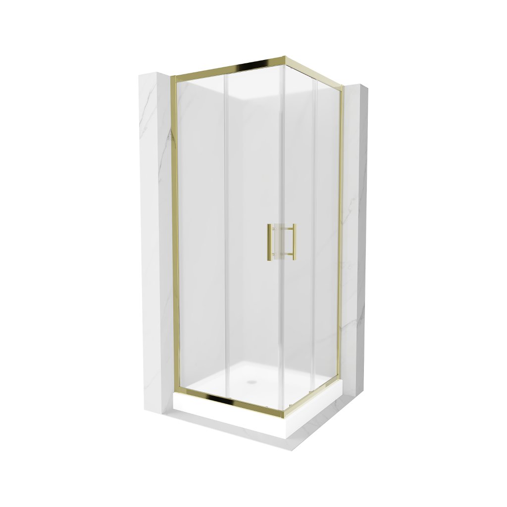Mexen Rio, čtvercový sprchový kout s posuvnými dveřmi 80 (dveře) x 80 (dveře) x 190 cm, 5mm sklo námraza, zlatý profil + bílá sprchová vanička RIO, 860-080-080-50-30-4510