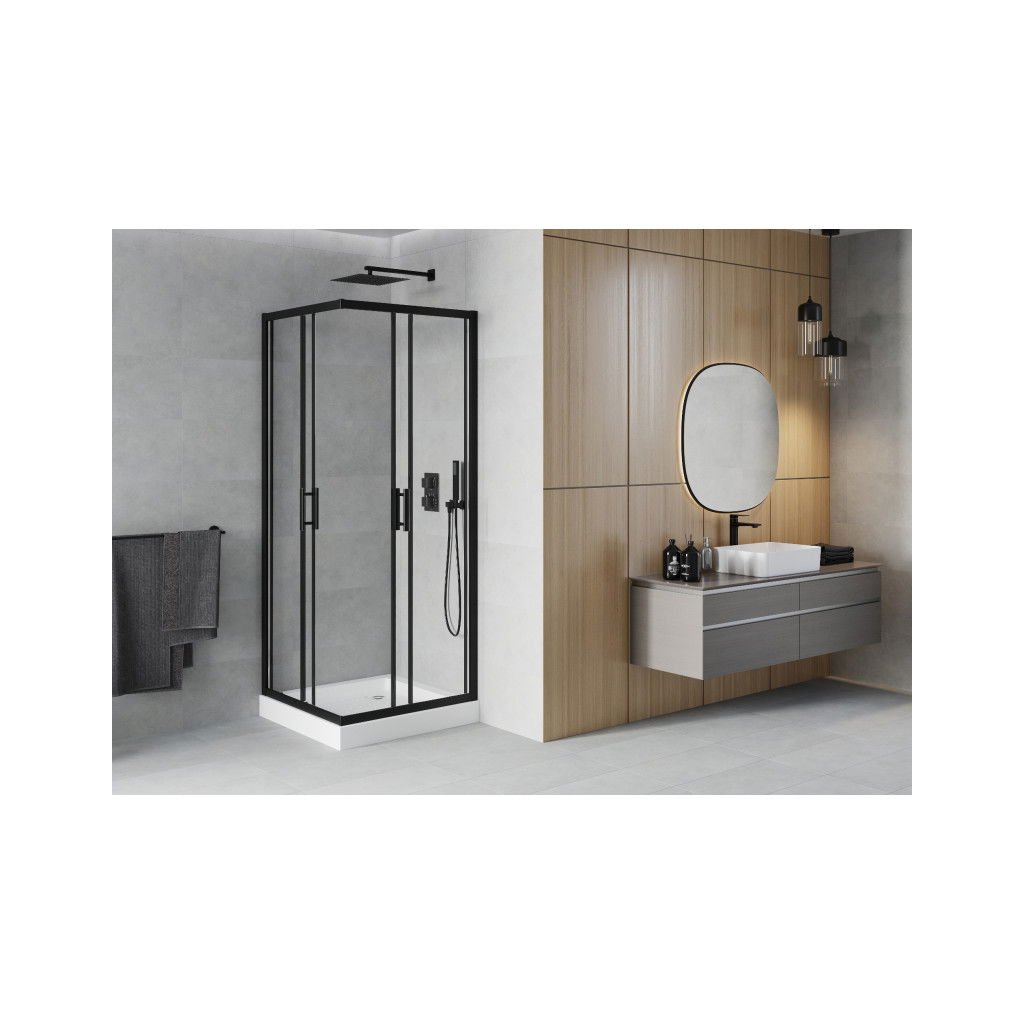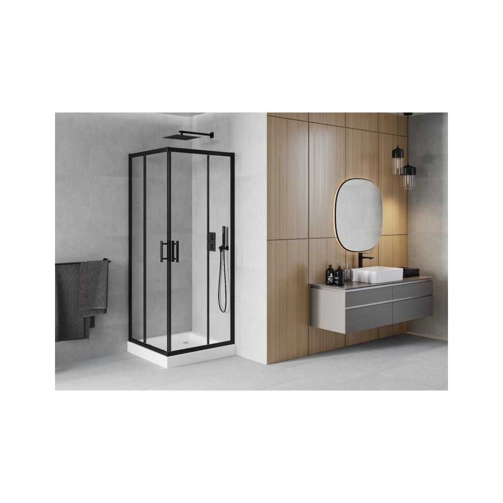 Mexen Rio, čtvercový sprchový kout s posuvnými dveřmi 80 x 80 cm, 5mm čiré sklo, černý profil + bílá vysoká sprchová vanička Rio, 860-080-080-70-00-4510