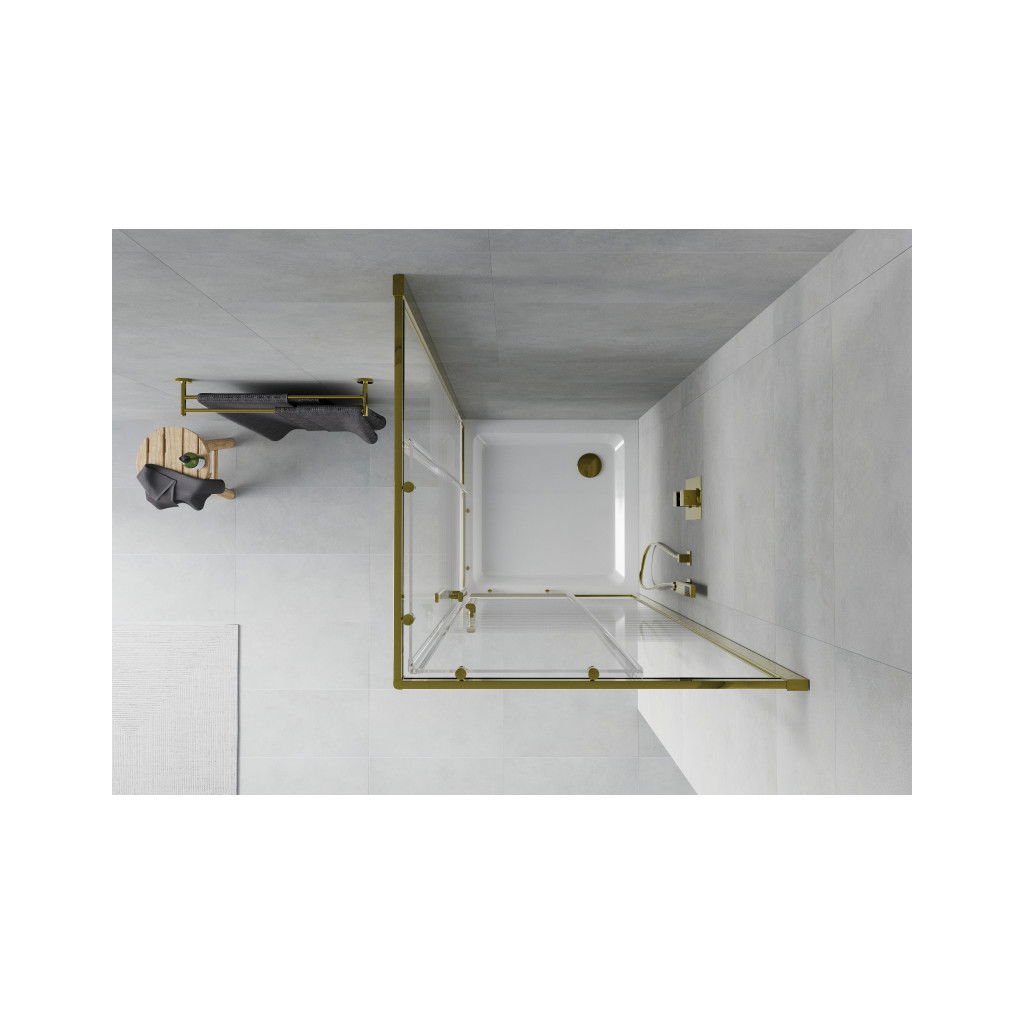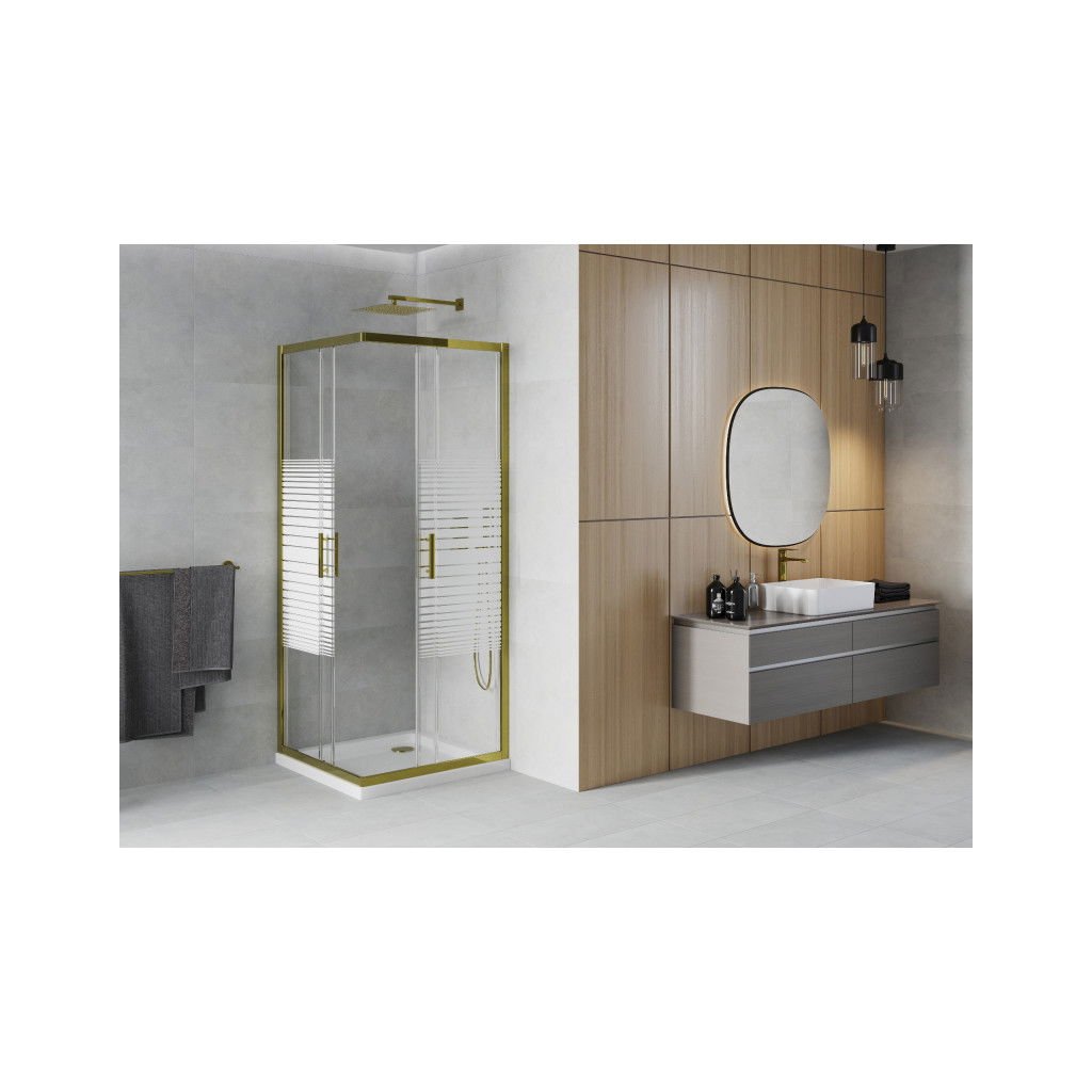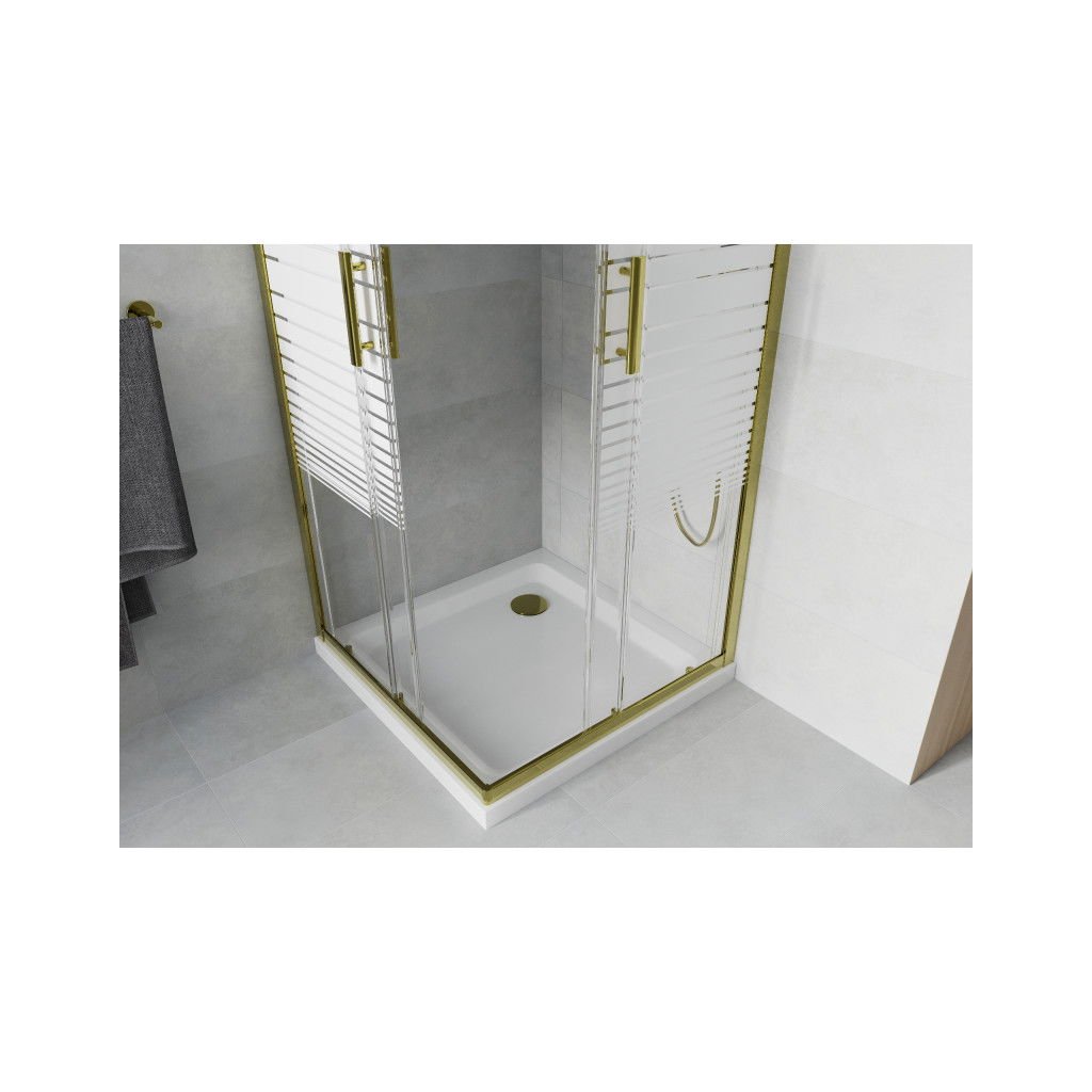 Mexen Rio, čtvercový sprchový kout s posuvnými dveřmi 90 (dveře) x 90 (dveře) x 190 cm, 5mm čiré sklo s pásky, zlatý profil + bílá sprchová vanička SLIM, 860-090-090-50-20-4010G