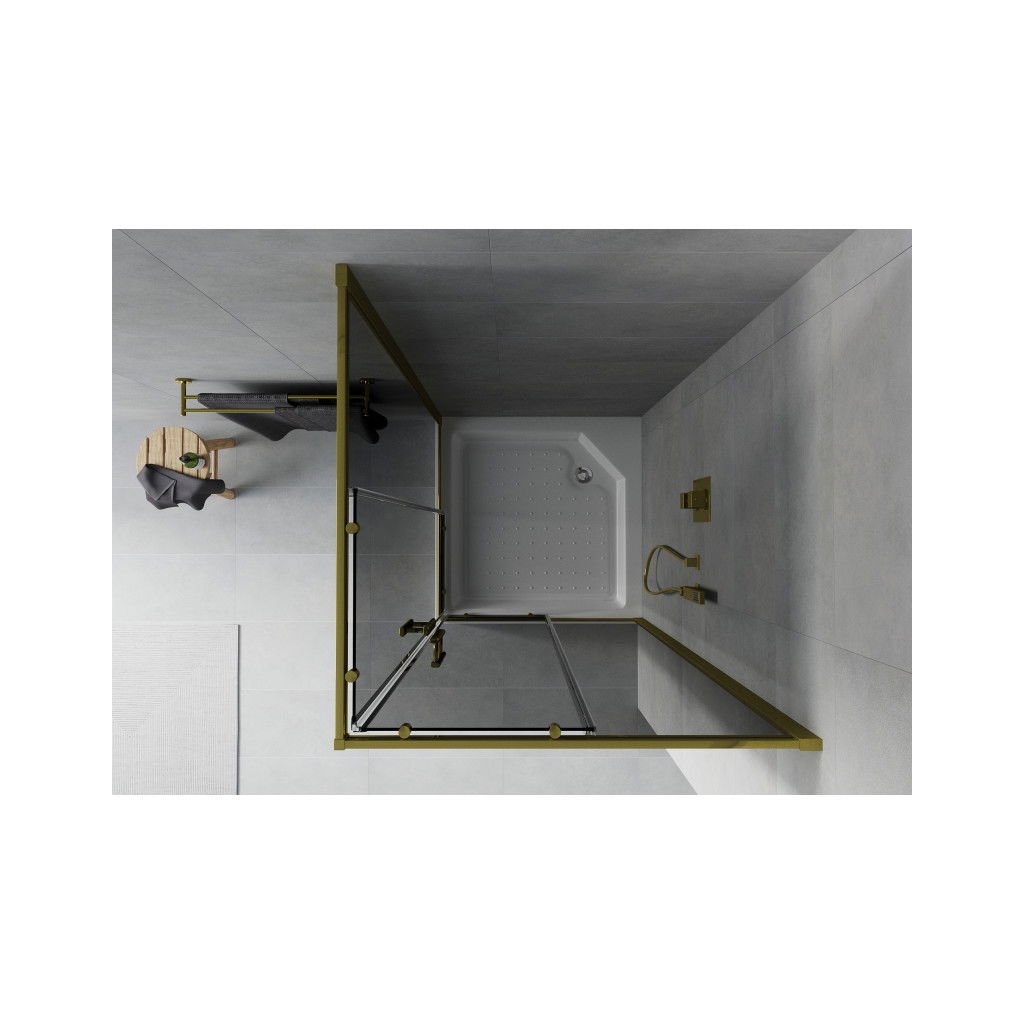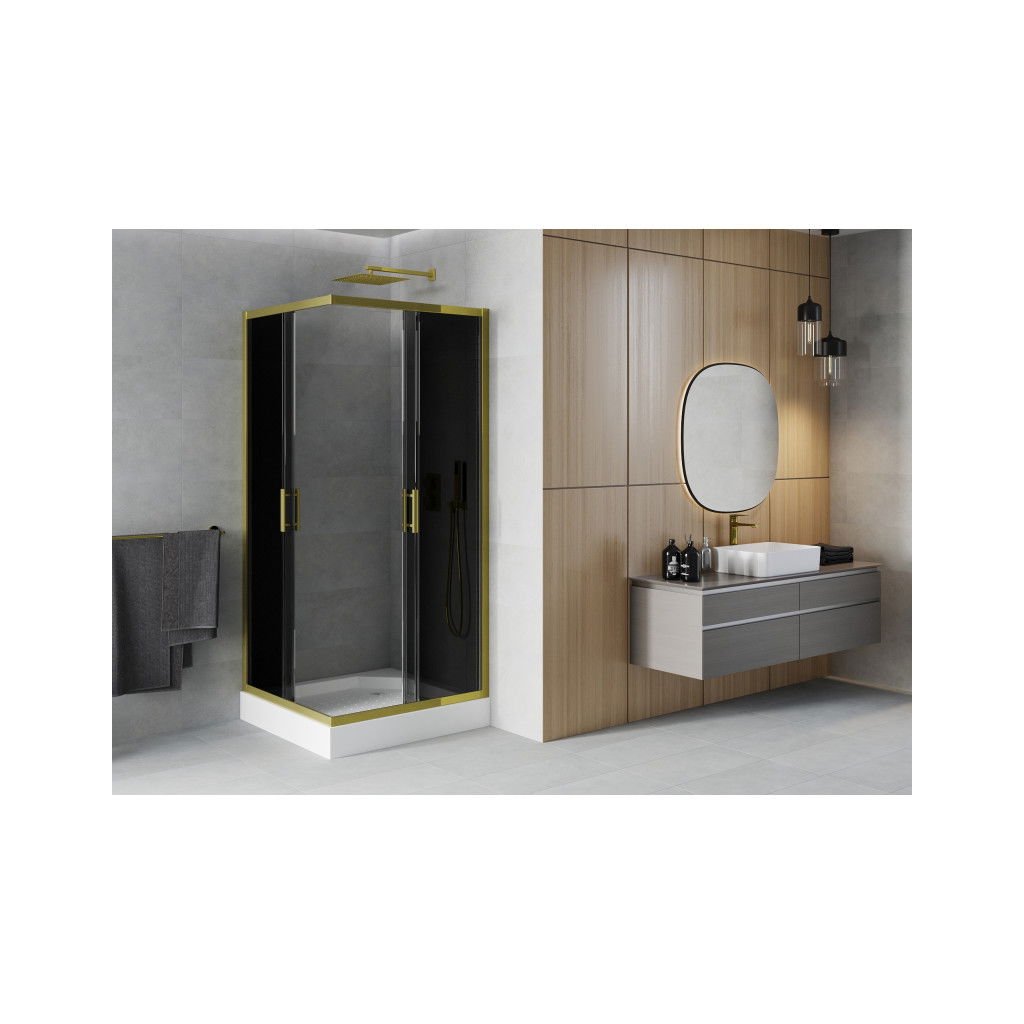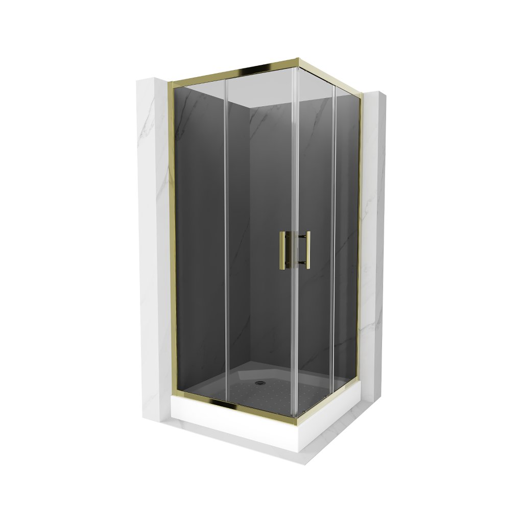 Mexen Rio, čtvercový sprchový kout s posuvnými dveřmi 90 (dveře) x 90 (dveře) x 190 cm, 5mm šedé sklo, zlatý profil + černá sprchová vanička RIO, 860-090-090-50-40-4510
