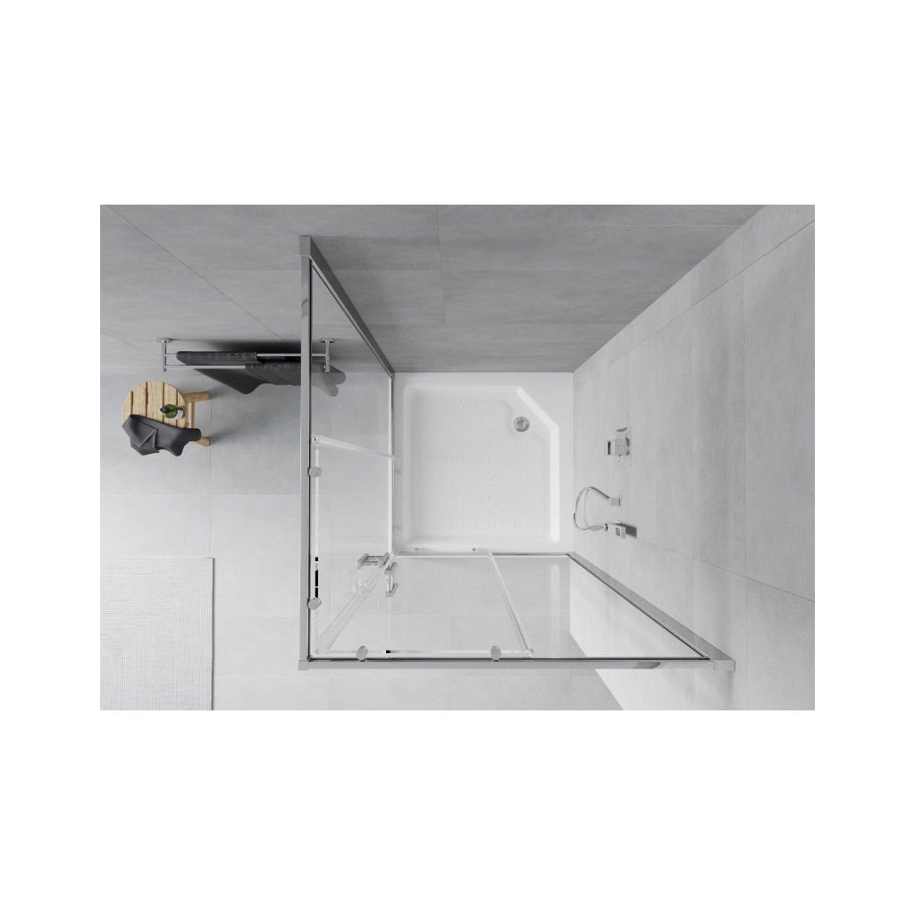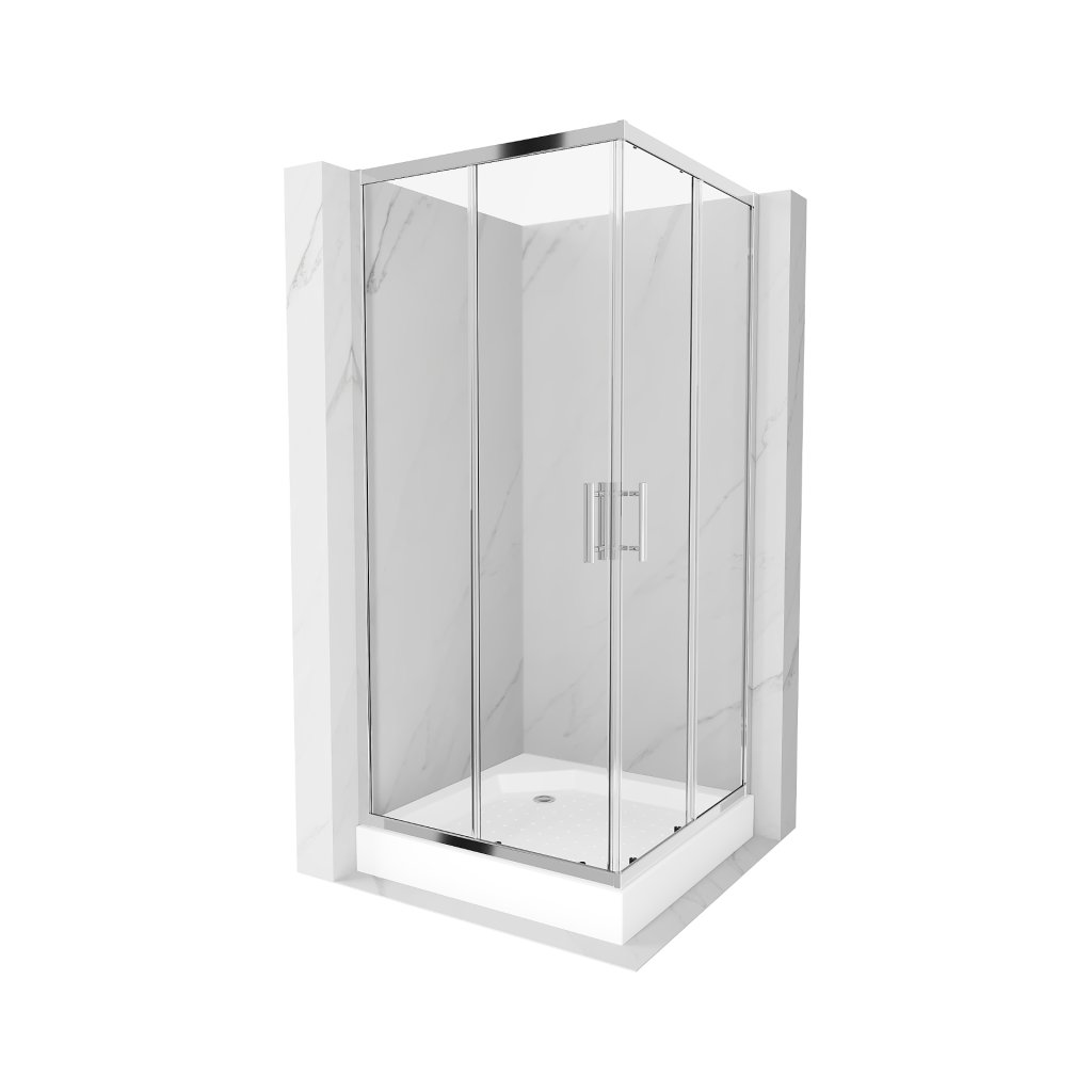 Mexen Rio, čtvercový sprchový kout s posuvnými dveřmi 90 x 90 cm, 5mm čiré sklo, chromový profil + bílá vysoká sprchová vanička Rio, 860-090-090-01-00-4510