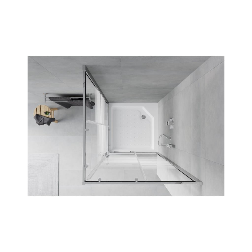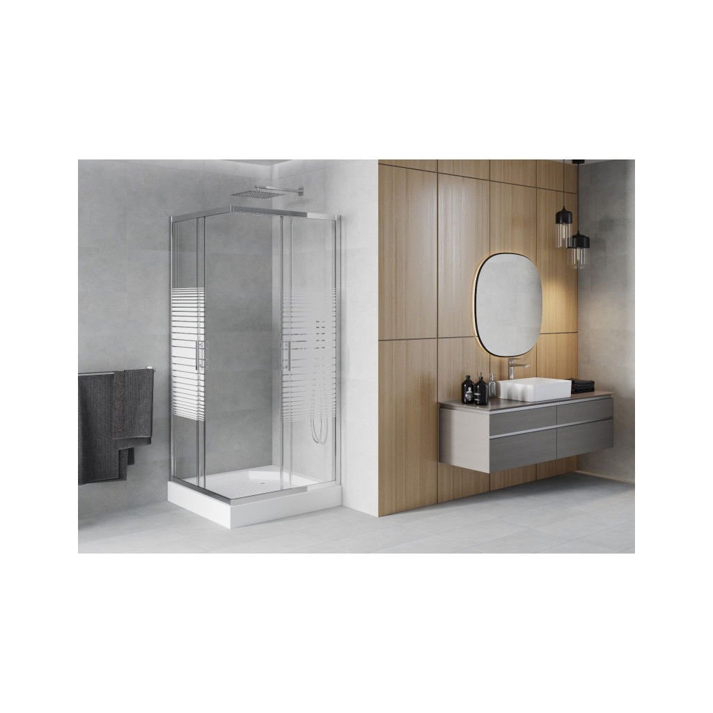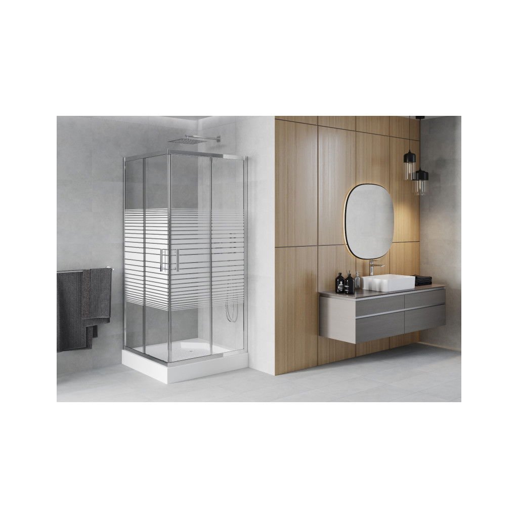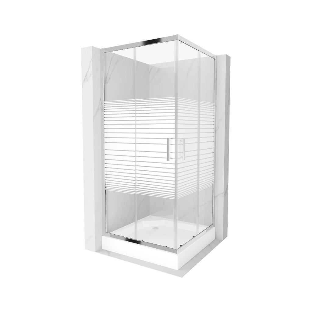 Mexen Rio, čtvercový sprchový kout s posuvnými dveřmi 90 x 90 cm, 5mm čiré sklo/pásy, chromový profil + bílá vysoká sprchová vanička Rio, 860-090-090-01-20-4510
