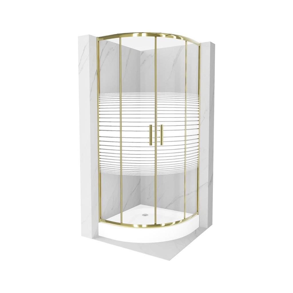 Mexen Rio, čtvrtkruhový sprchový kout 70(dveře)x70(dveře)x190 cm, 5mm čiré sklo s pásky, zlatý profil + bílá sprchová vanička RIO, 863-070-070-50-20-4710