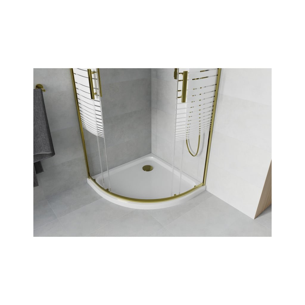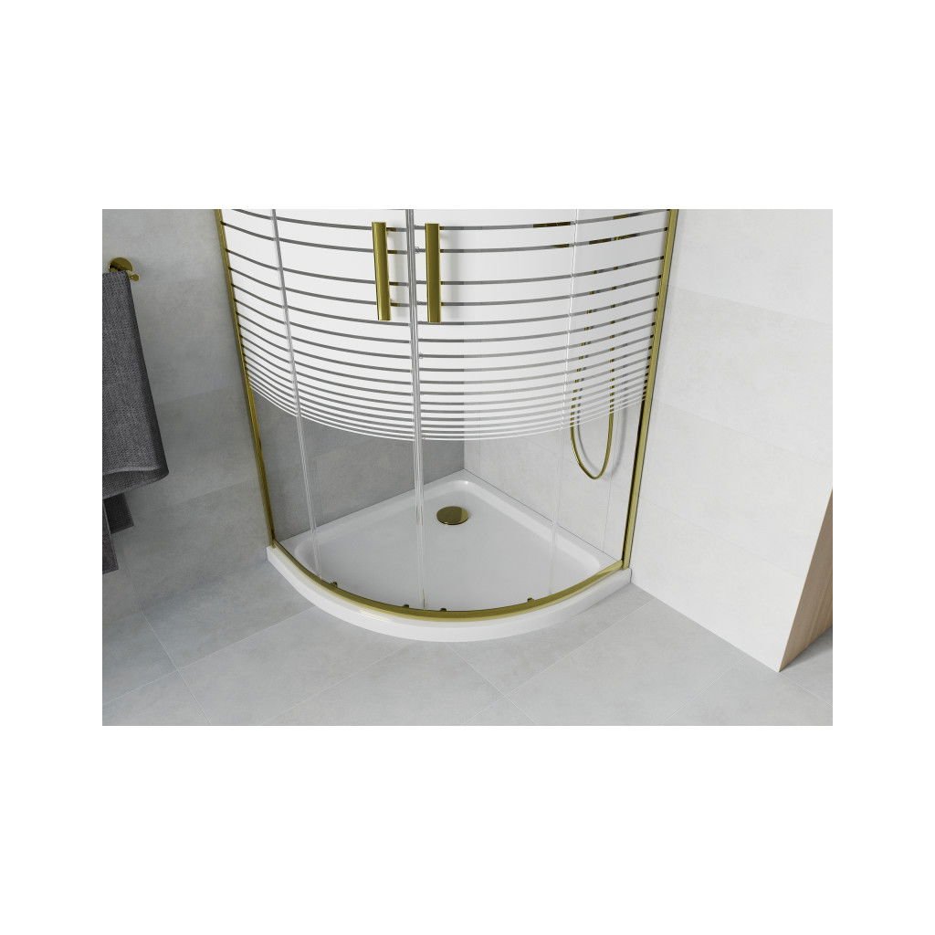 Mexen Rio, čtvrtkruhový sprchový kout 80(dveře)x80(dveře)x190 cm, 5mm čiré sklo s pásky, zlatý profil + bílá sprchová vanička SLIM, 863-080-080-50-20-4110G