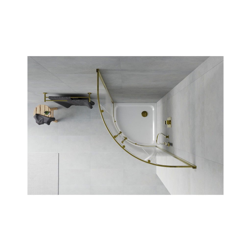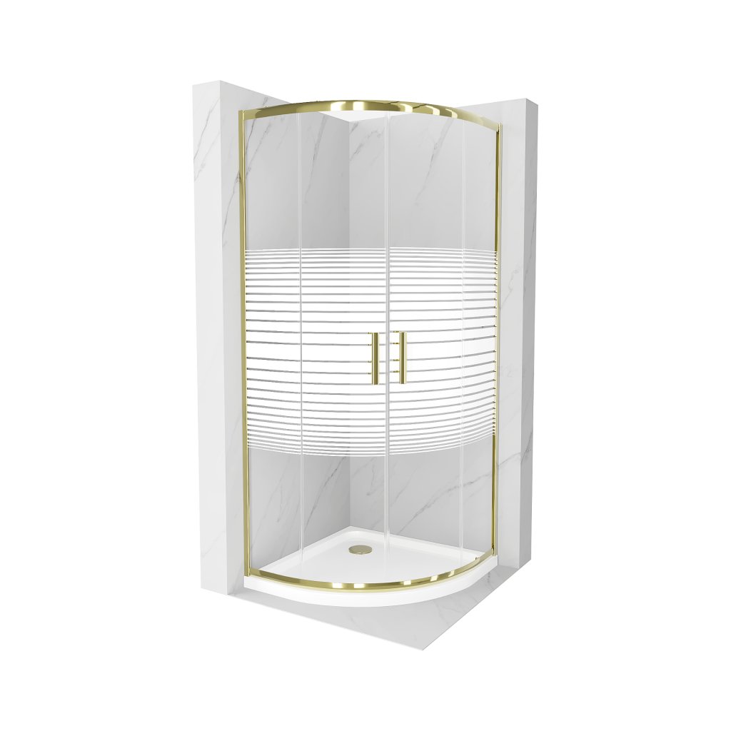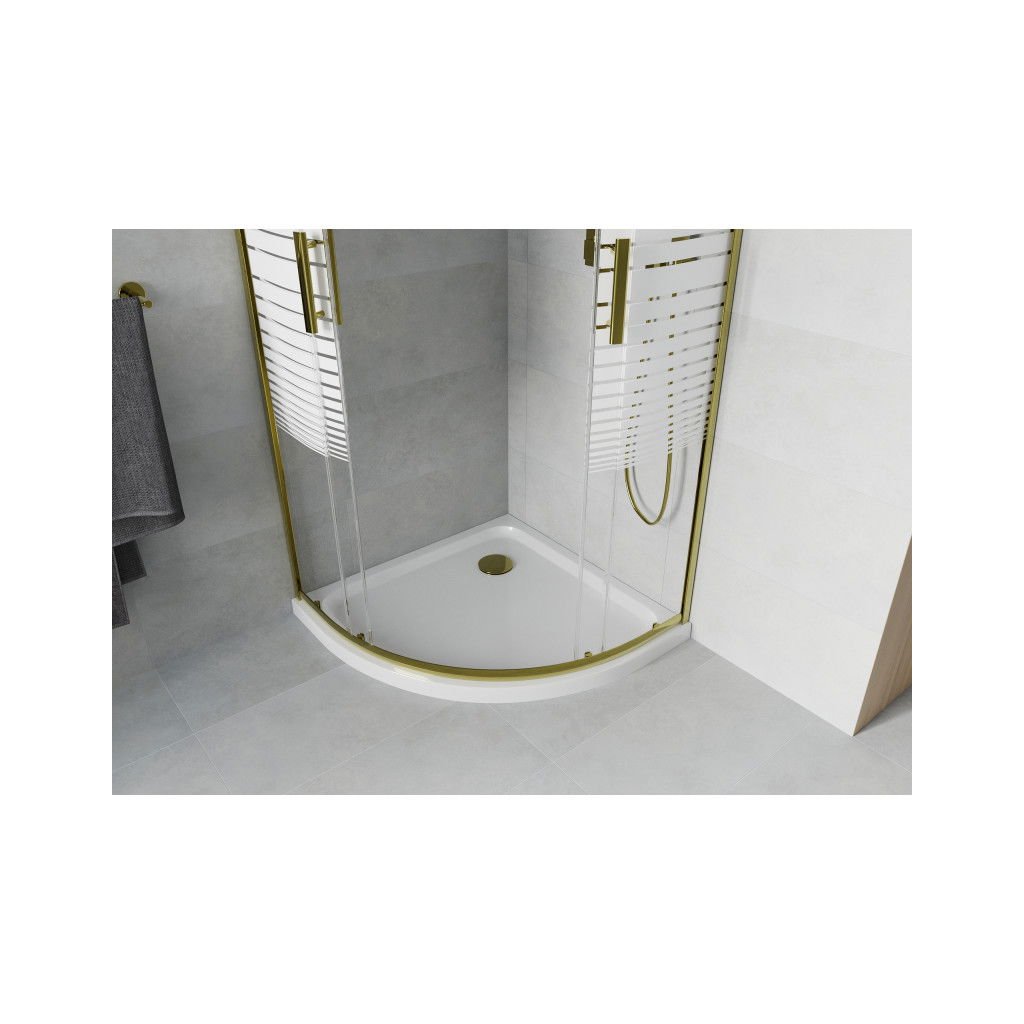 Mexen Rio, čtvrtkruhový sprchový kout 90(dveře)x90(dveře)x190 cm, 5mm čiré sklo s pásky, zlatý profil + bílá sprchová vanička SLIM, 863-090-090-50-20-4110G