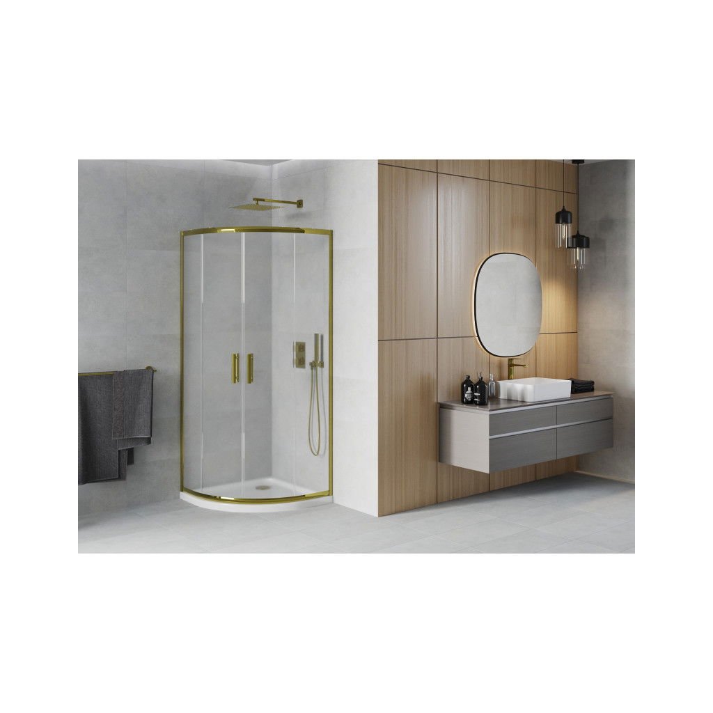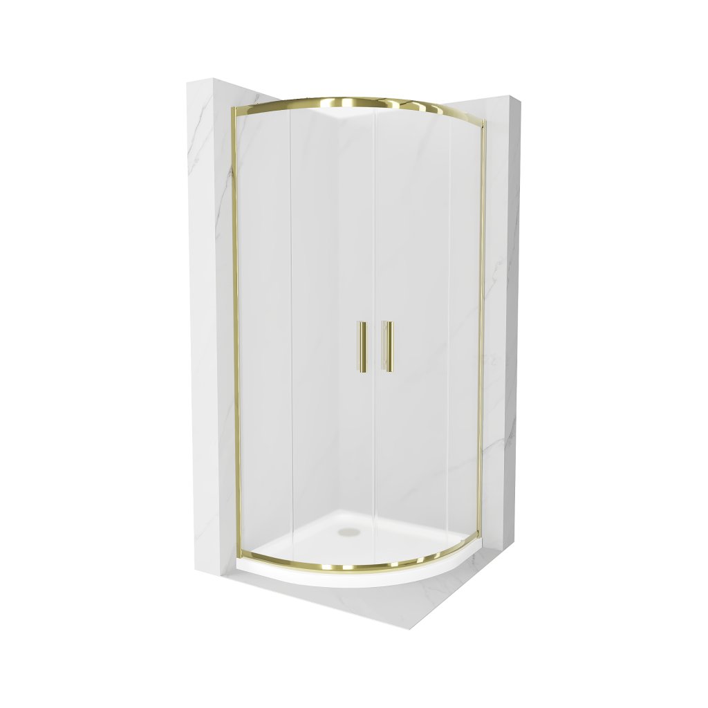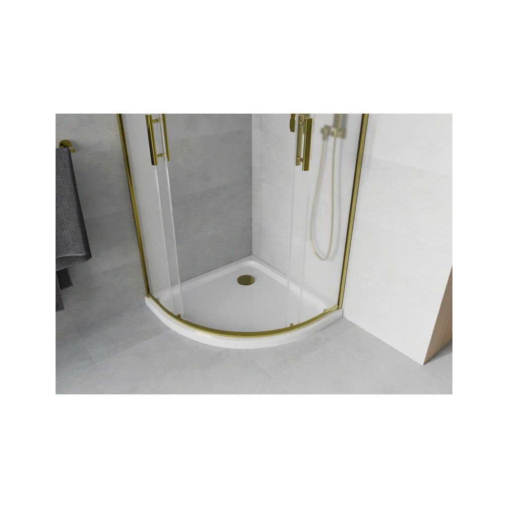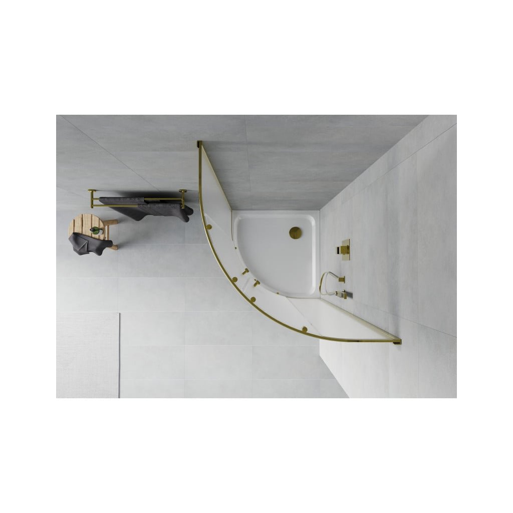 Mexen Rio, čtvrtkruhový sprchový kout 90(dveře)x90(dveře)x190 cm, 5mm sklo námraza, zlatý profil + bílá sprchová vanička SLIM, 863-090-090-50-30-4110G
