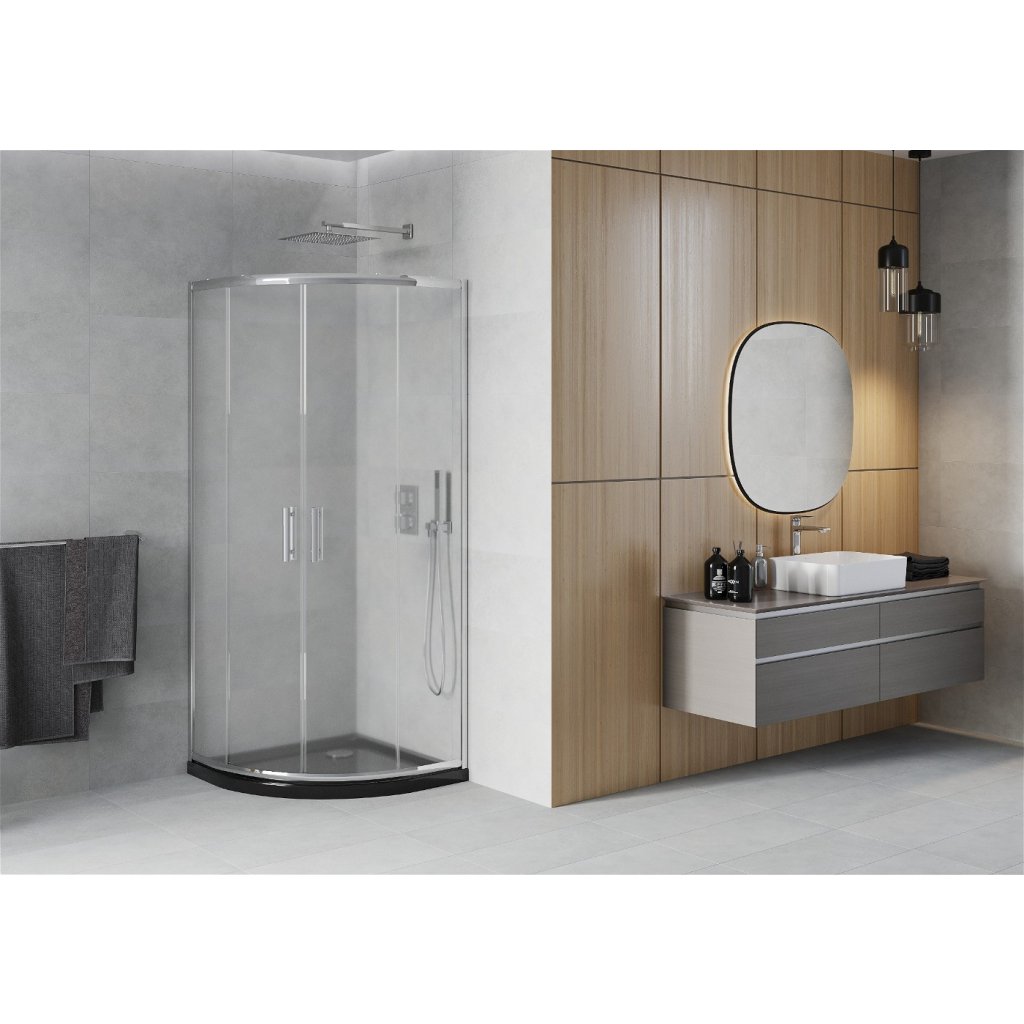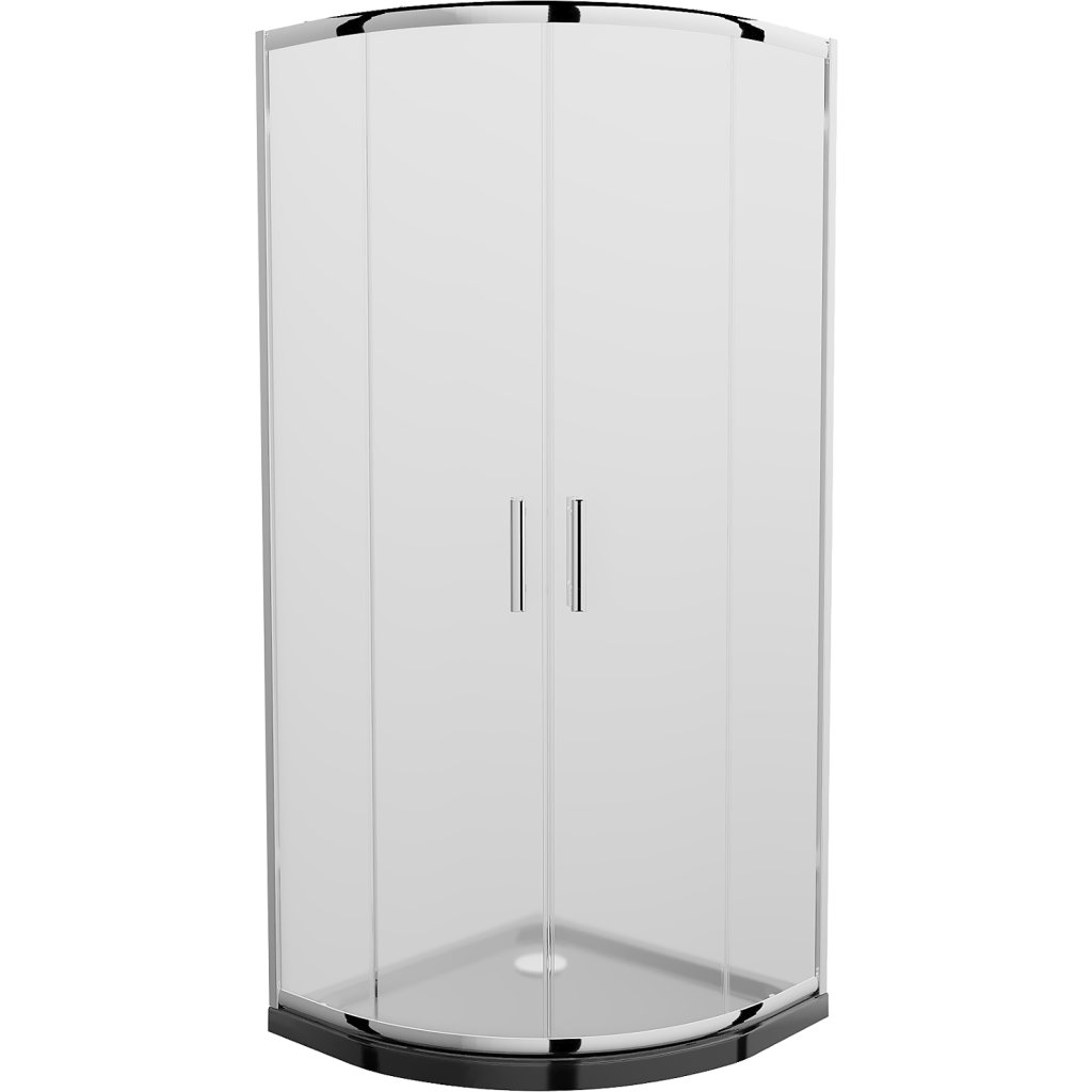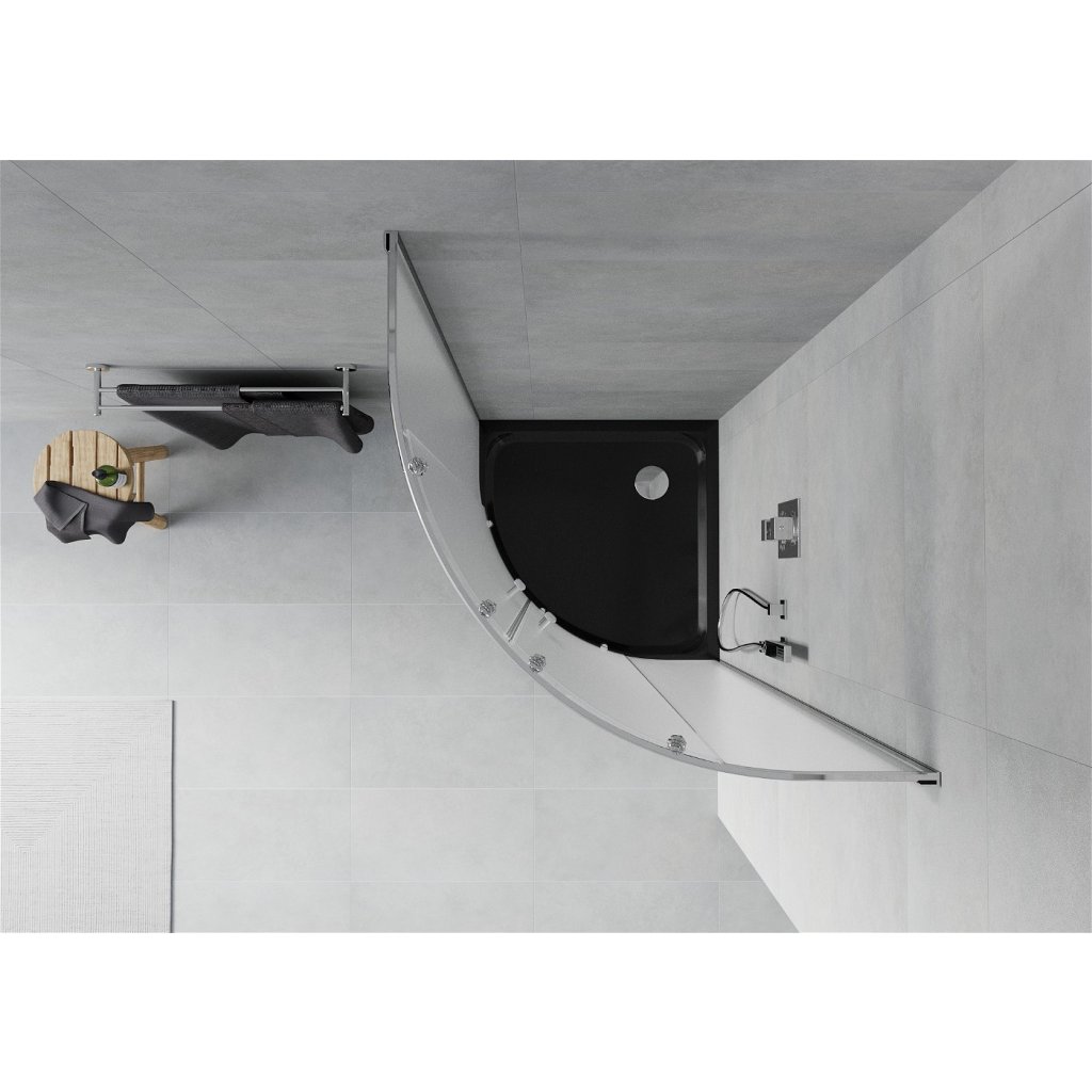 Mexen Rio, čtvrtkruhový sprchový kout s posuvnými dveřmi 70 x 70 cm, 5mm sklo námraza, chromový profil + černá sprchová vanička, 863-070-070-01-30-4170