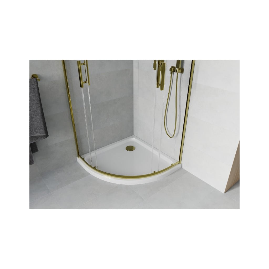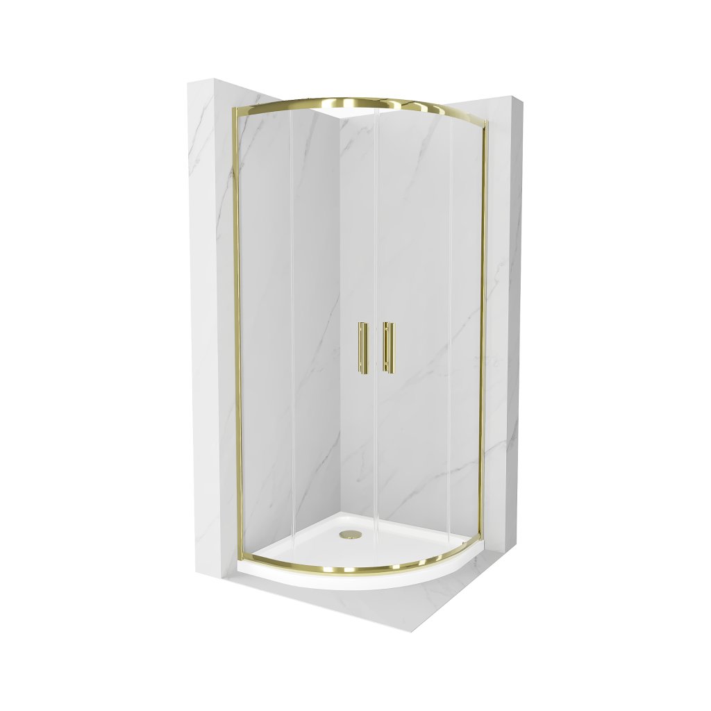 Mexen Rio, čtvrtkruhový sprchový kout s posuvnými dveřmi 80 (dveře) x 80 (dveře) x 190 cm, 5mm čiré sklo, zlatý profil + bílá sprchová vanička SLIM, 863-080-080-50-00-4110G
