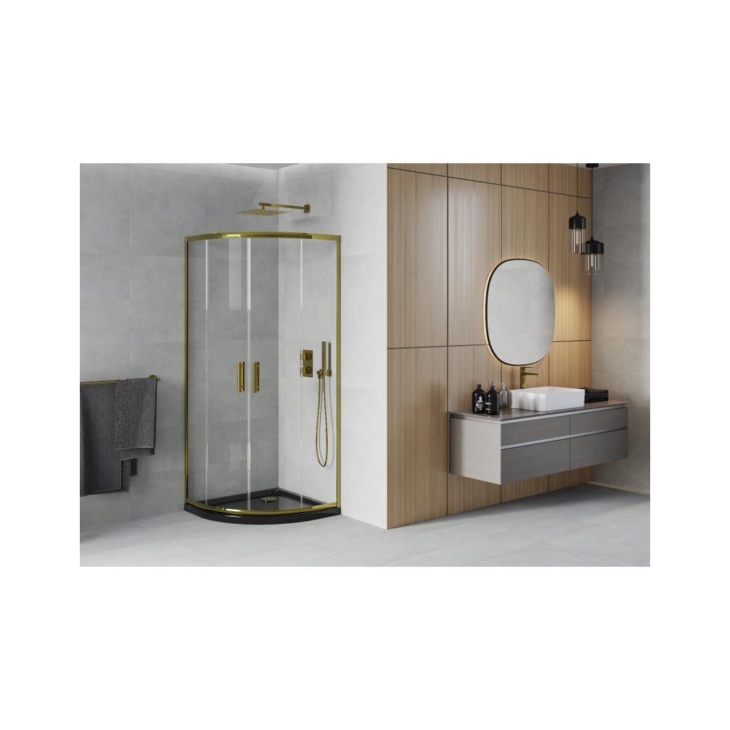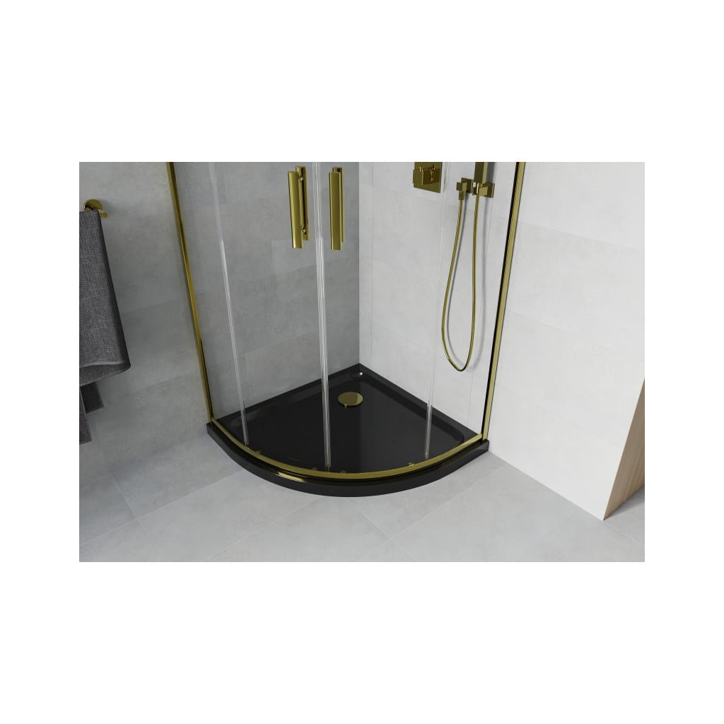 Mexen Rio, čtvrtkruhový sprchový kout s posuvnými dveřmi 80 (dveře) x 80 (dveře) x 190 cm, 5mm čiré sklo, zlatý profil + černá sprchová vanička SLIM, 863-080-080-50-00-4170G