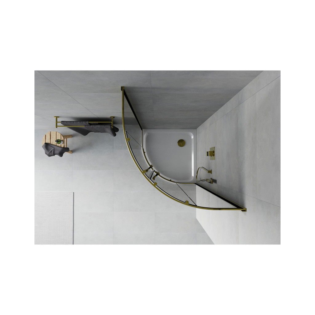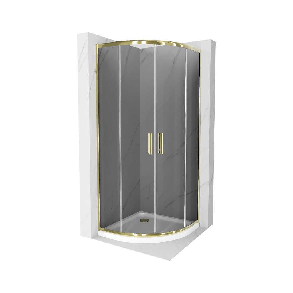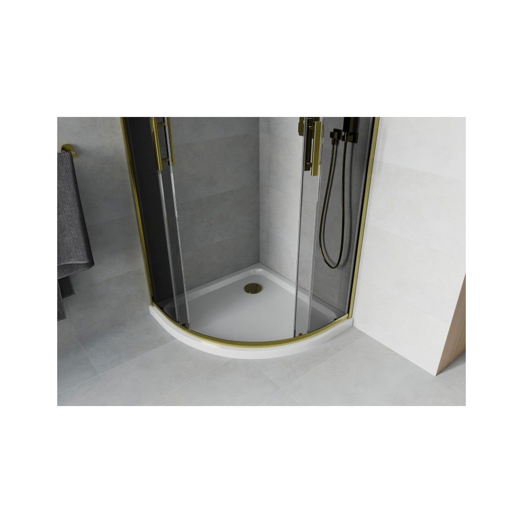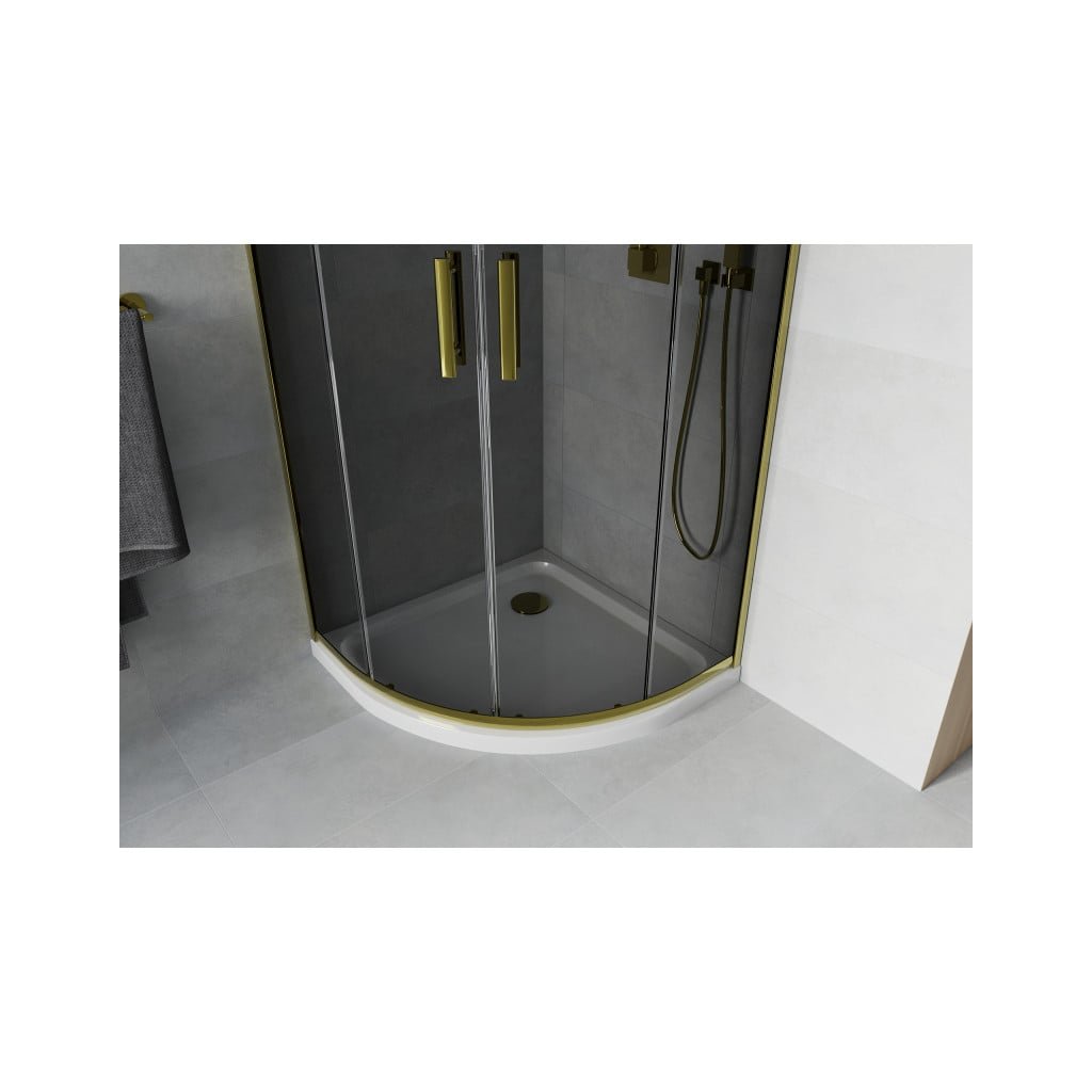 Mexen Rio, čtvrtkruhový sprchový kout s posuvnými dveřmi 80 (dveře) x 80 (dveře) x 190 cm, 5mm šedé sklo, zlatý profil + bílá sprchová vanička SLIM, 863-080-080-50-40-4110G