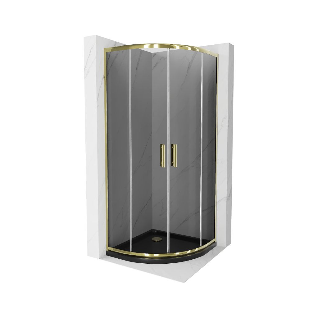 Mexen Rio, čtvrtkruhový sprchový kout s posuvnými dveřmi 80 (dveře) x 80 (dveře) x 190 cm, 5mm šedé sklo, zlatý profil + černá sprchová vanička SLIM, 863-080-080-50-40-4170G