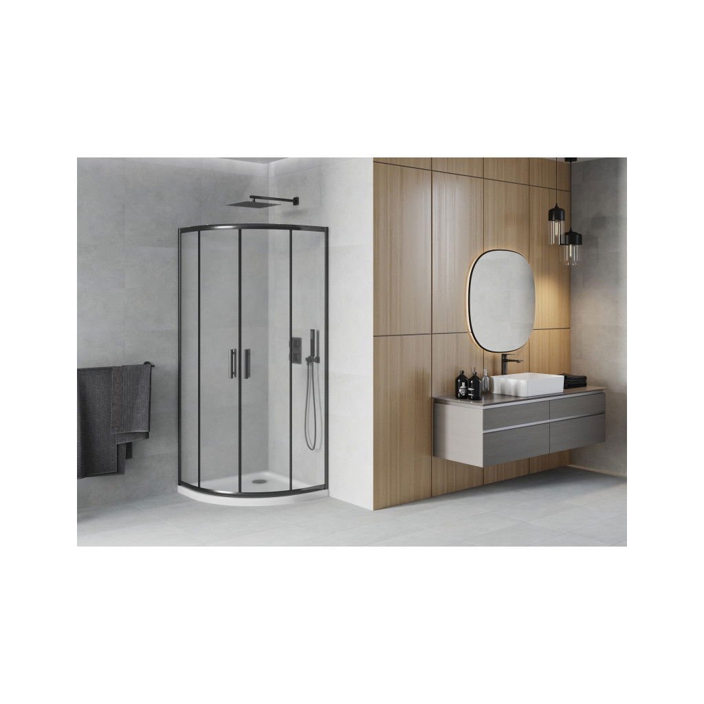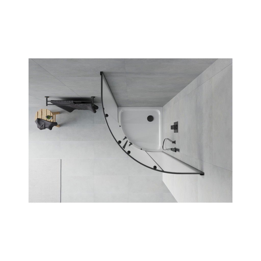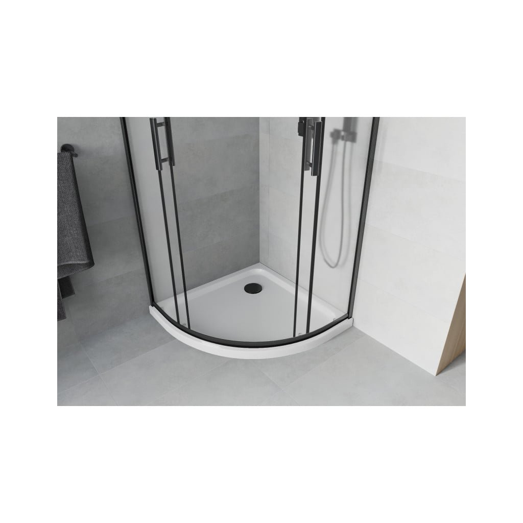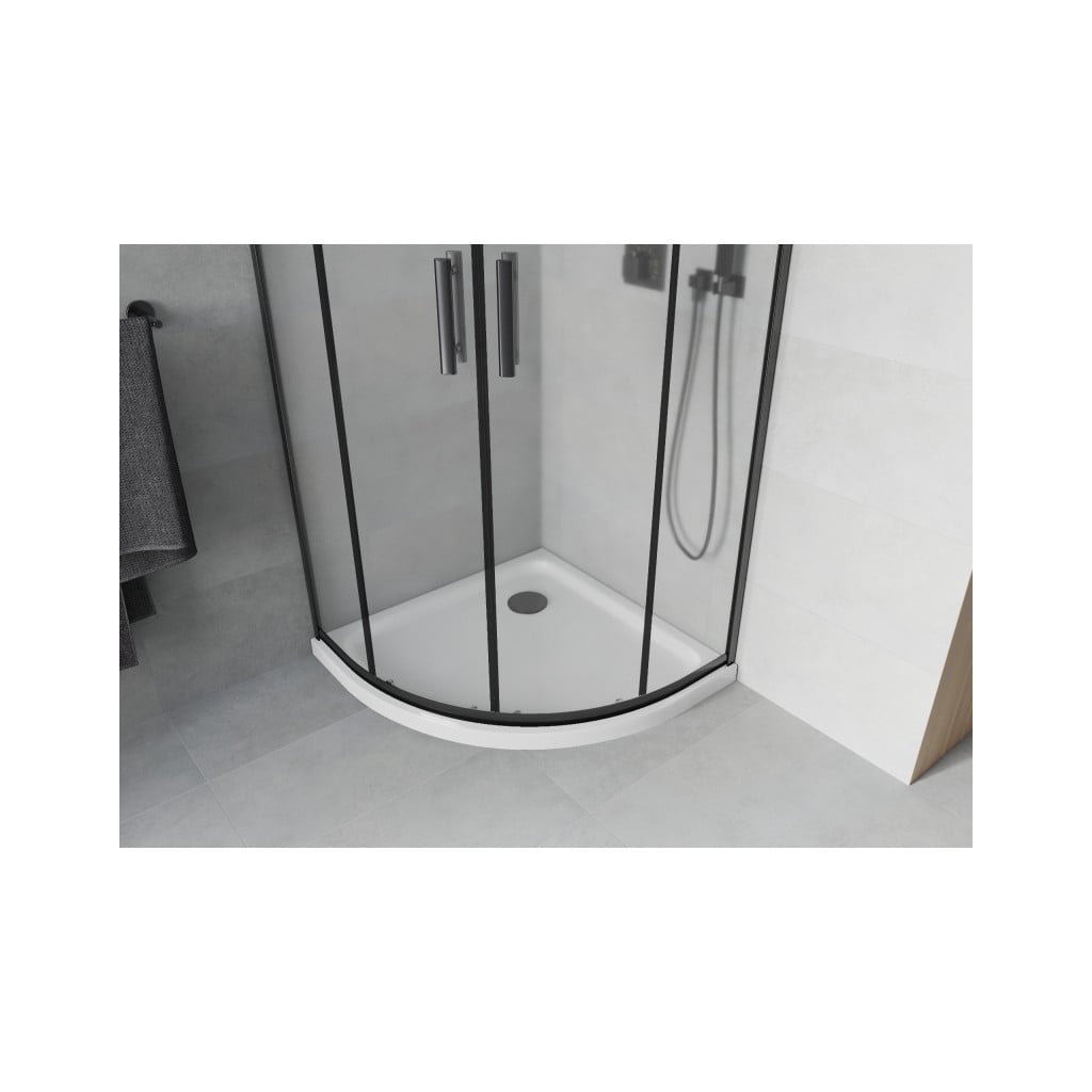 Mexen Rio, čtvrtkruhový sprchový kout s posuvnými dveřmi 80 (dveře) x 80 (dveře) x 190 cm, 5mm sklo námraza, černý profil + bílá sprchová vanička SLIM, 863-080-080-70-30-4110B