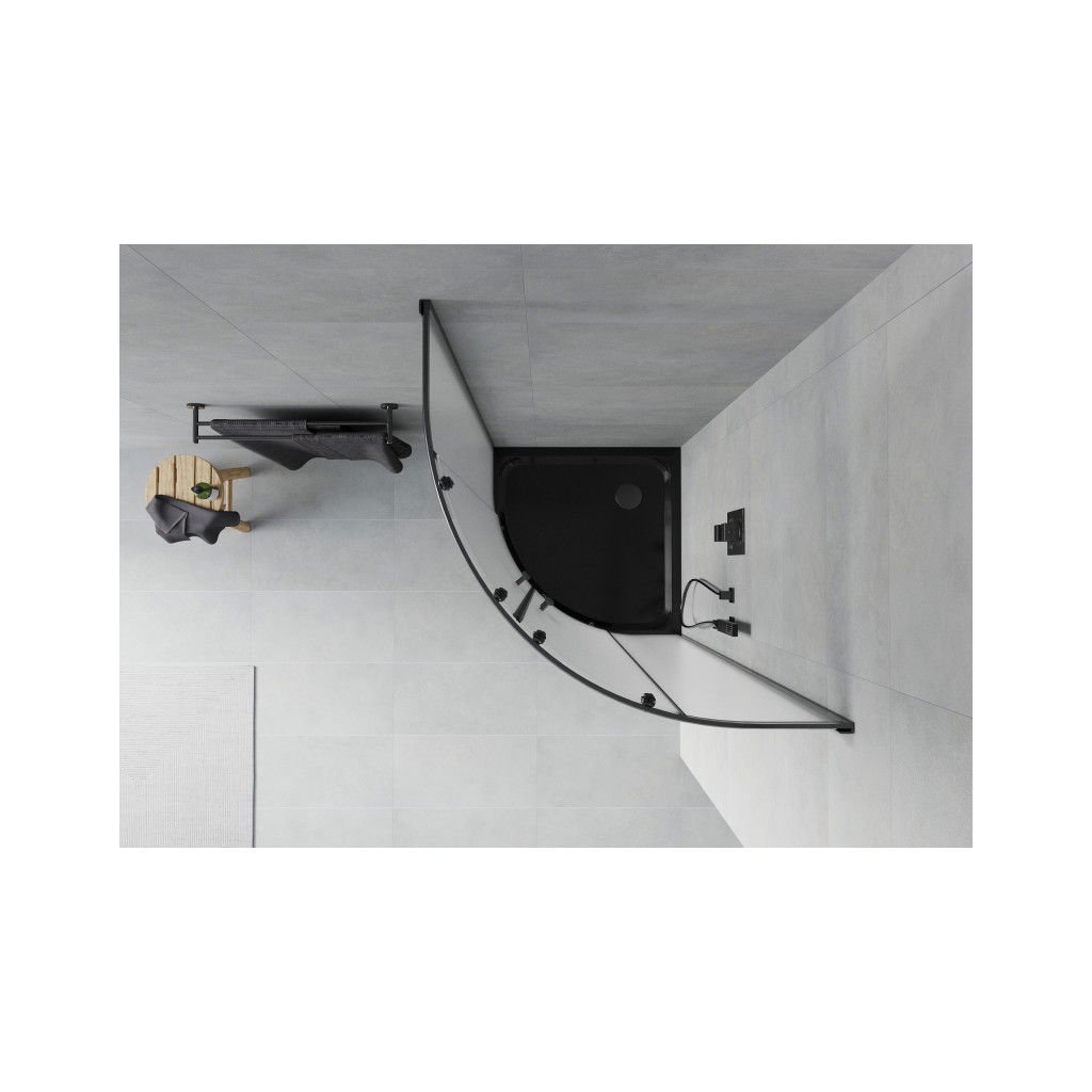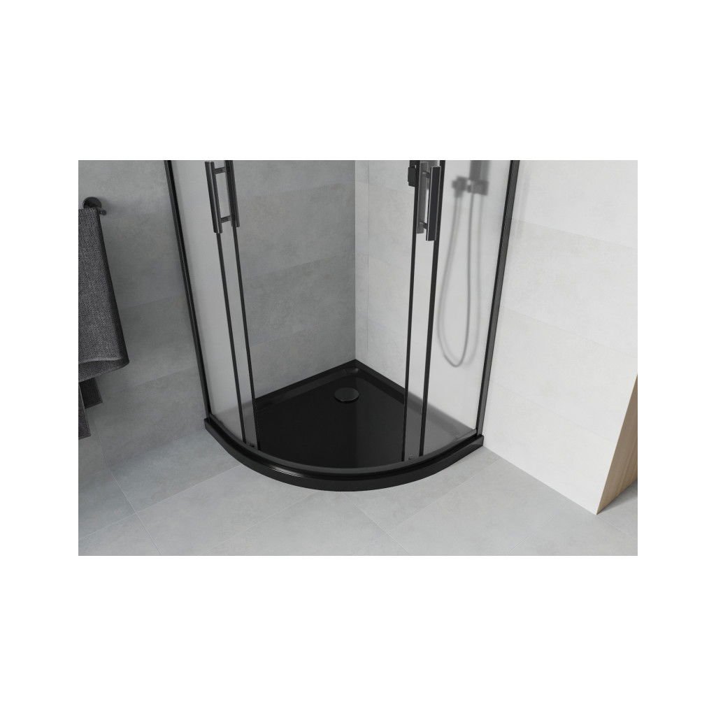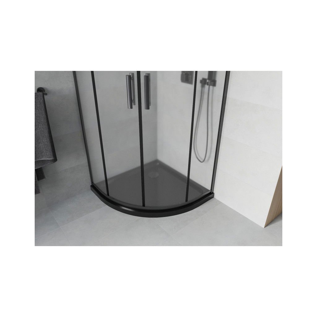 Mexen Rio, čtvrtkruhový sprchový kout s posuvnými dveřmi 80 (dveře) x 80 (dveře) x 190 cm, 5mm sklo námraza, černý profil + černá sprchová vanička SLIM, 863-080-080-70-30-4170B