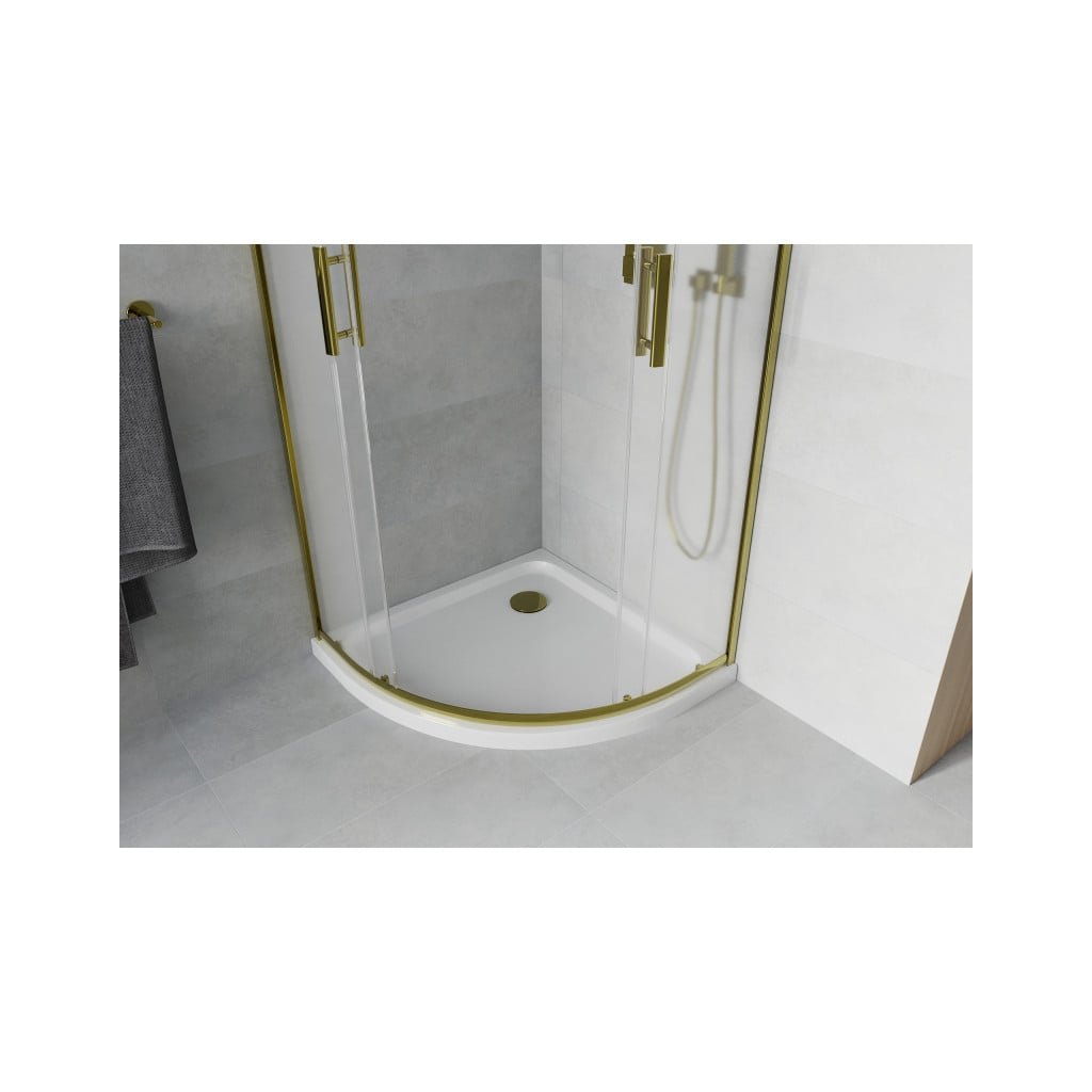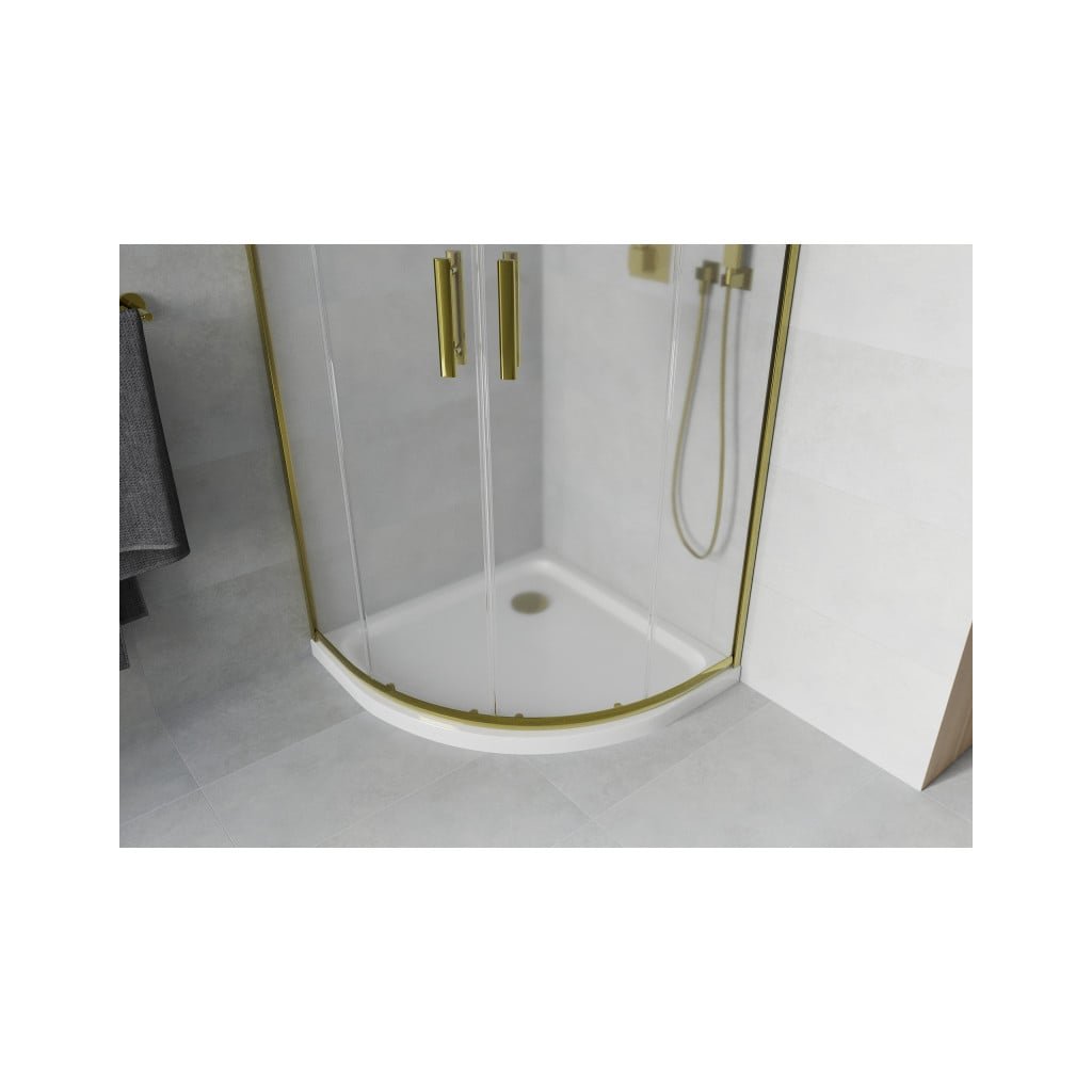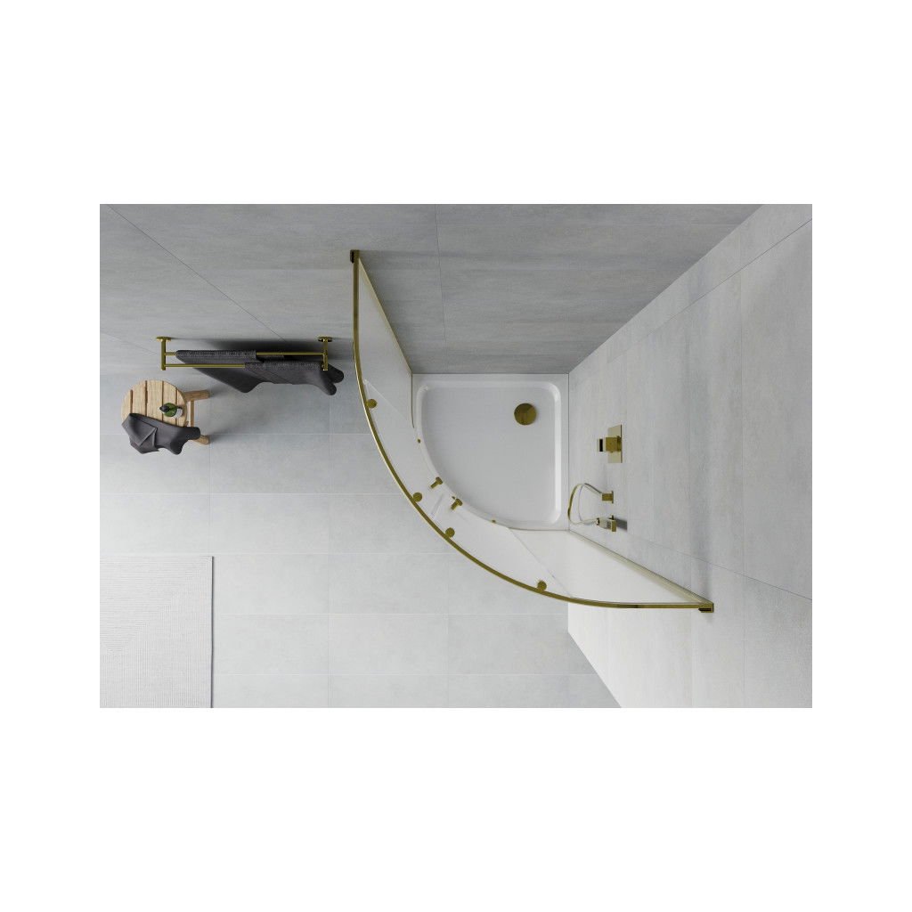 Mexen Rio, čtvrtkruhový sprchový kout s posuvnými dveřmi 80 (dveře) x 80 (dveře) x 190 cm, 5mm sklo námraza, zlatý profil + bílá sprchová vanička SLIM, 863-080-080-50-30-4110G