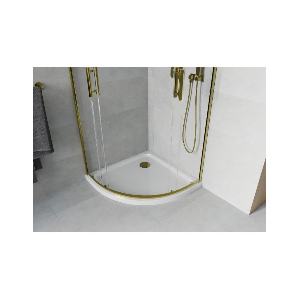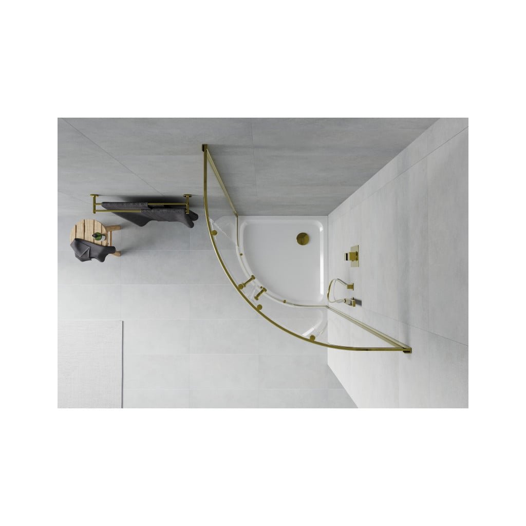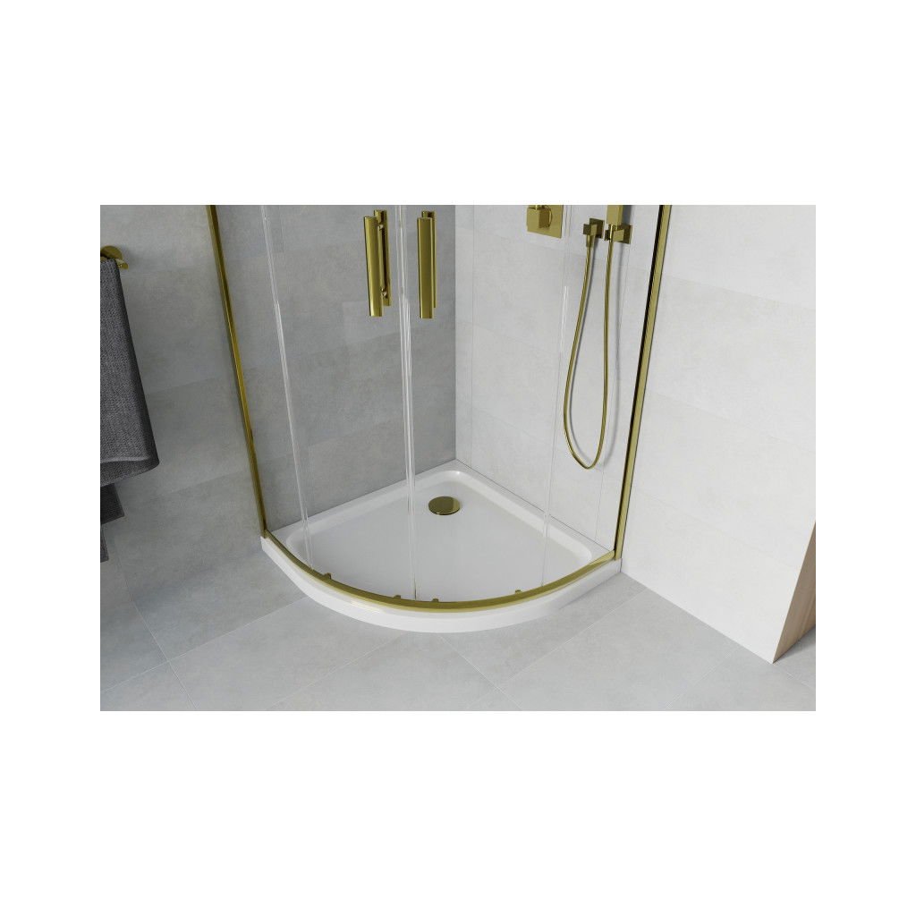 Mexen Rio, čtvrtkruhový sprchový kout s posuvnými dveřmi 90 (dveře) x 90 (dveře) x 190 cm, 5mm čiré sklo, zlatý profil + bílá sprchová vanička SLIM, 863-090-090-50-00-4110G