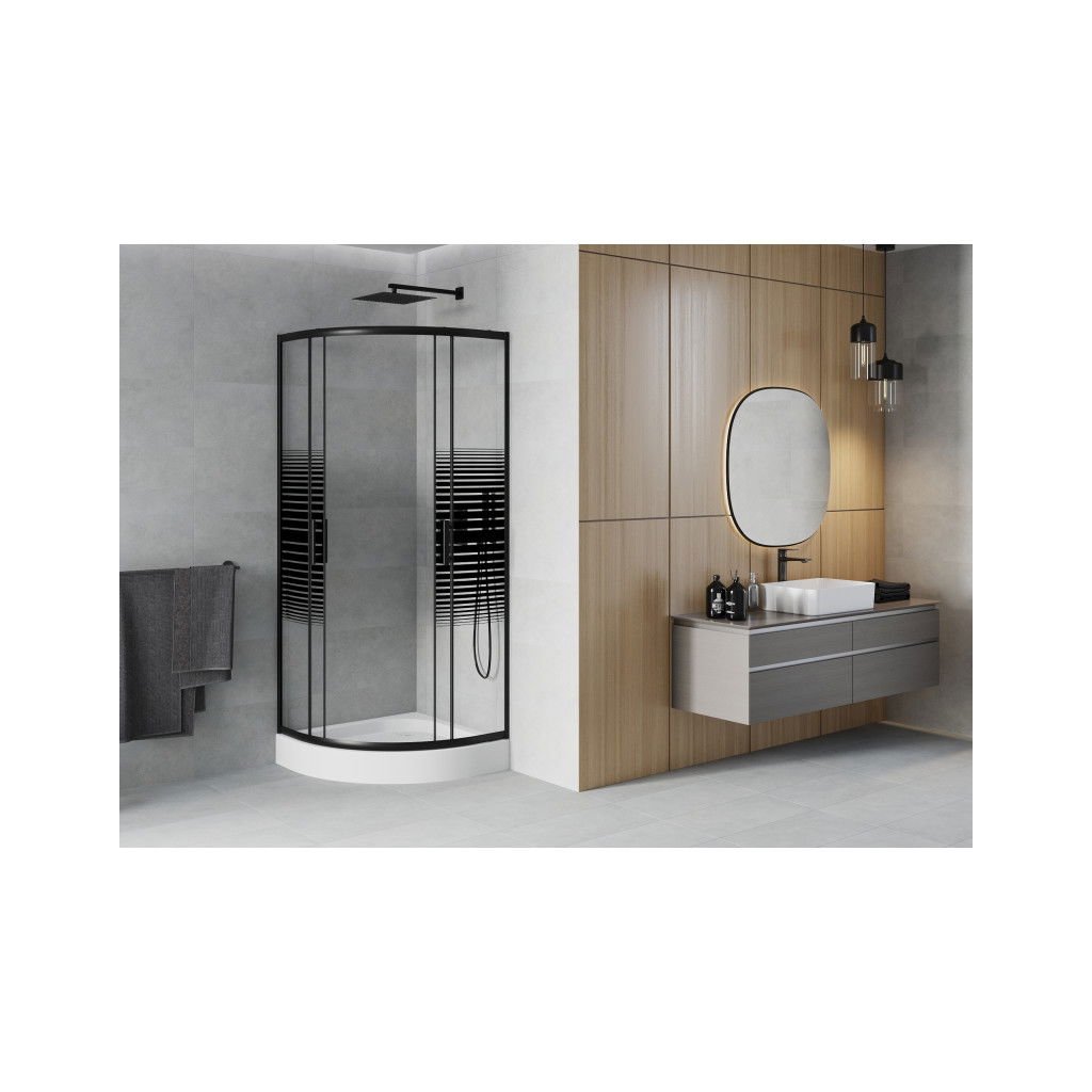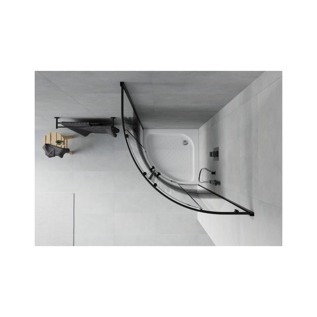 Mexen Rio, čtvrtkruhový sprchový kout s posuvnými dveřmi 90 (dveře) x 90 (dveře) x 190 cm, 5mm čiré sklo s pásky, černý profil + Rio sprchová vanička bílá, 863-090-090-70-20-4710