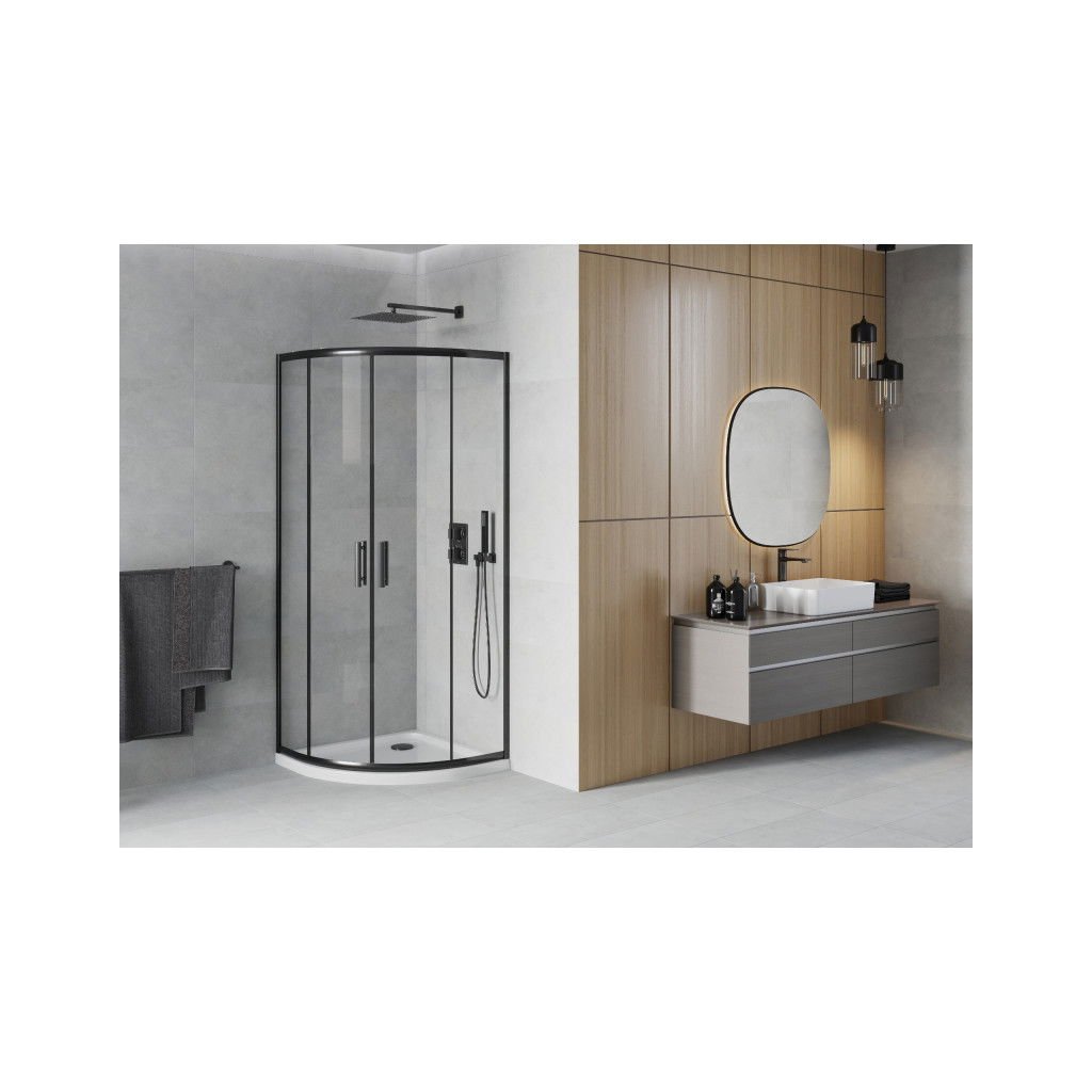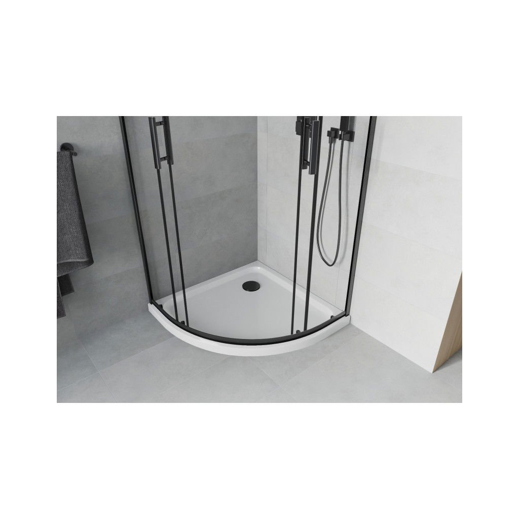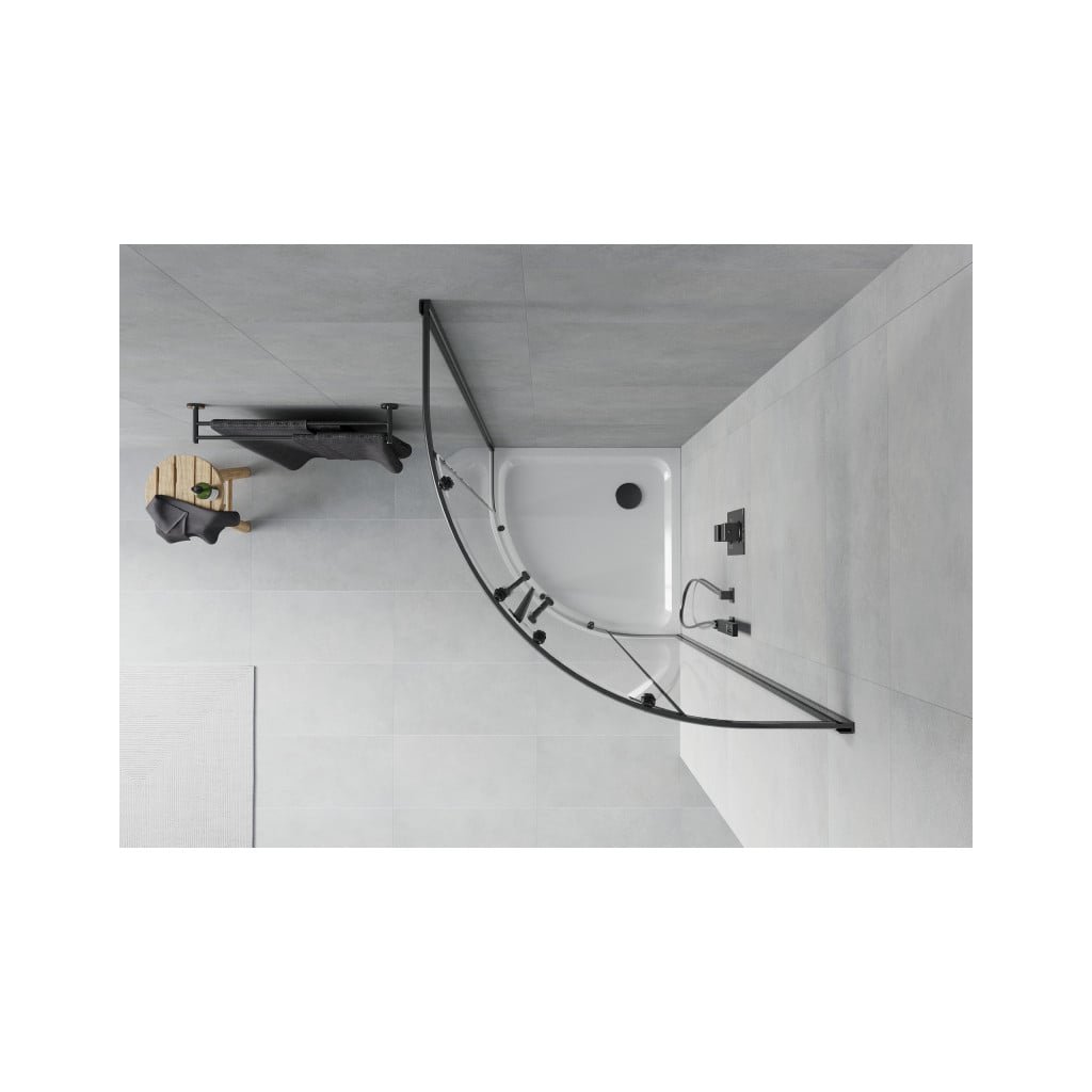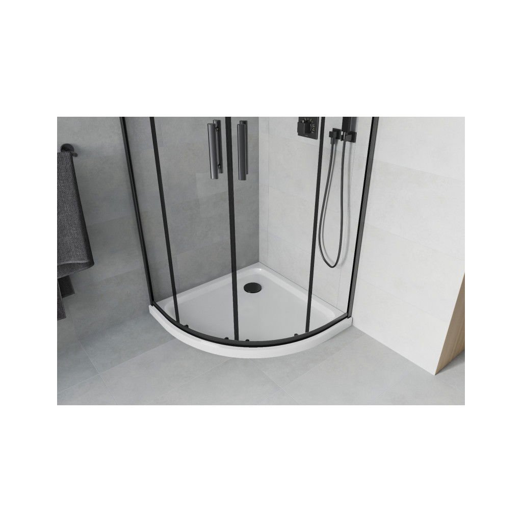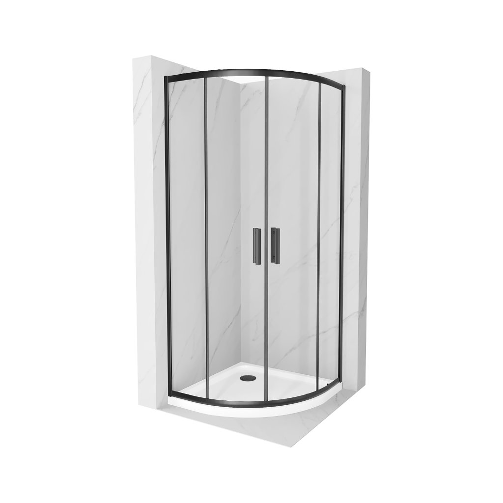 Mexen Rio, čtvrtkruhový sprchový kout s posuvnými dveřmi 90 x 90 cm, 5mm čiré sklo, černý profil + bílá sprchová vanička, 863-090-090-70-00-4110B