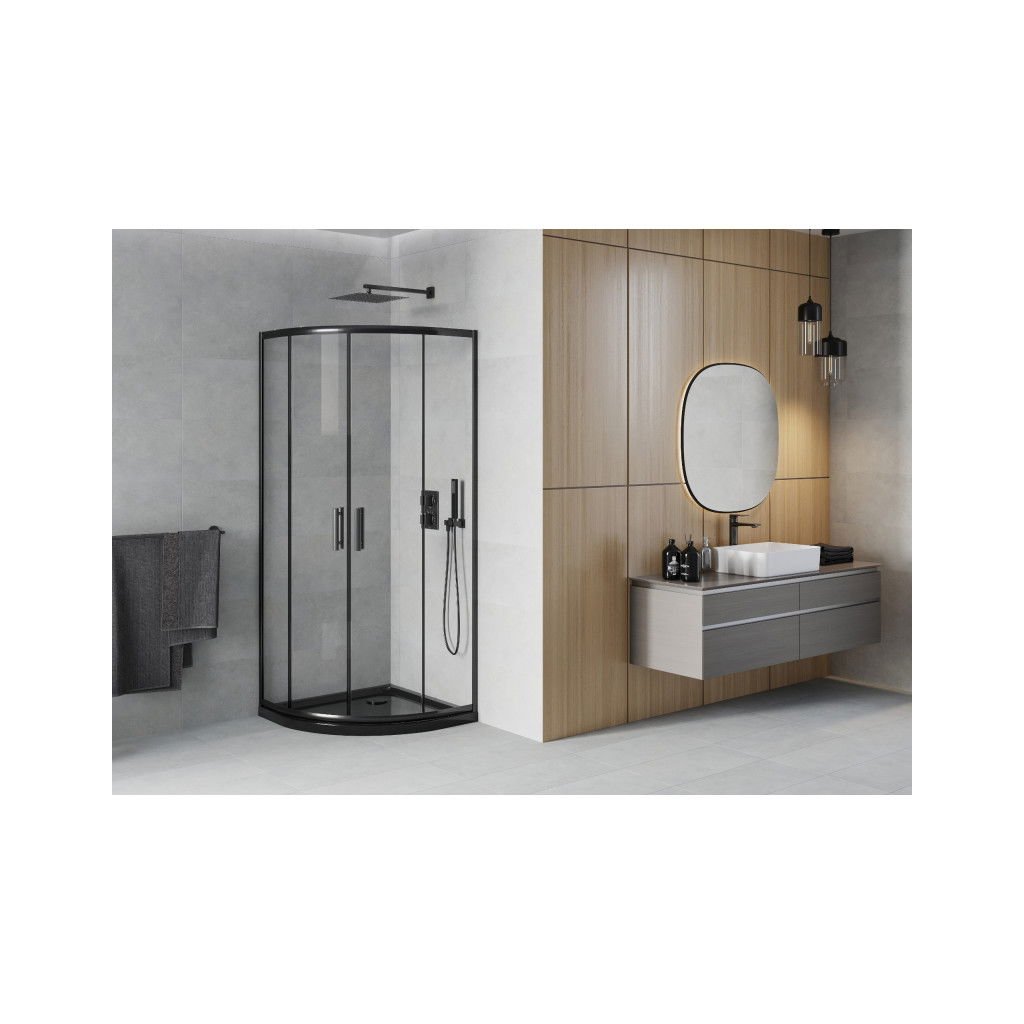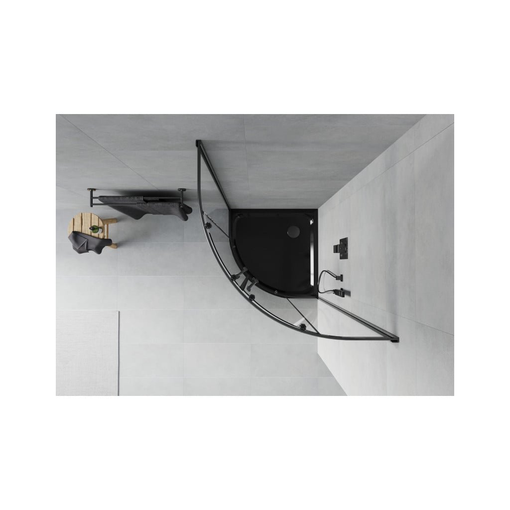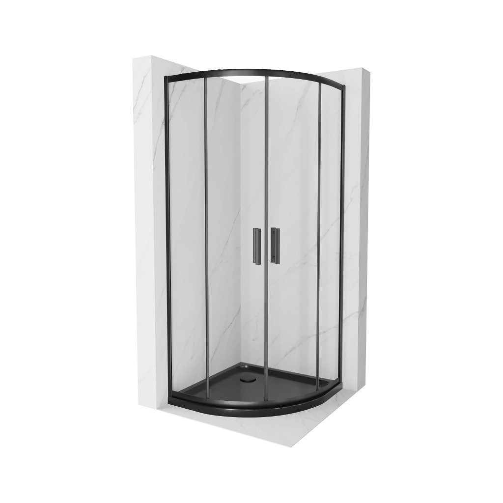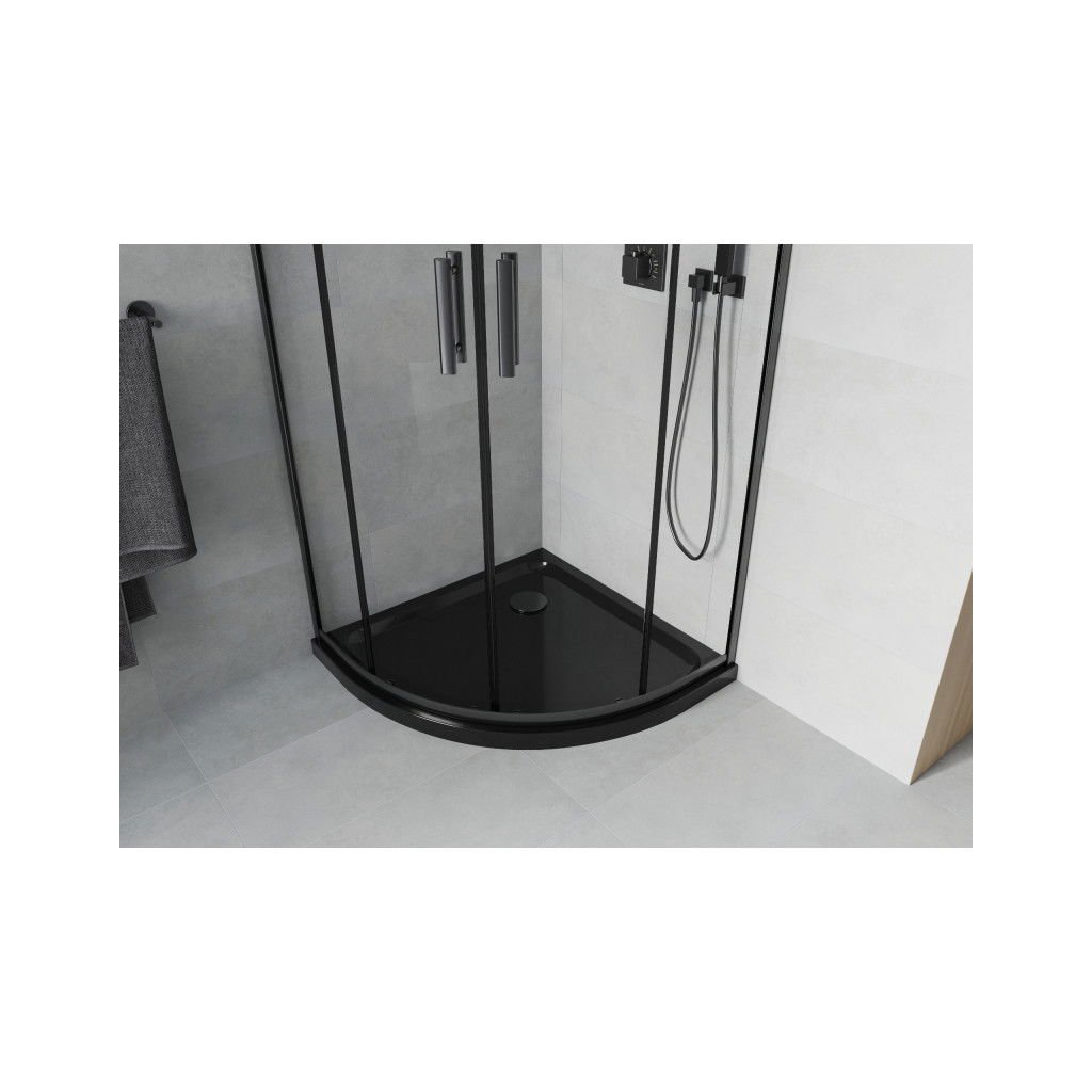 Mexen Rio, čtvrtkruhový sprchový kout s posuvnými dveřmi 90 x 90 cm, 5mm čiré sklo, černý profil + černá sprchová vanička, 863-090-090-70-00-4170B