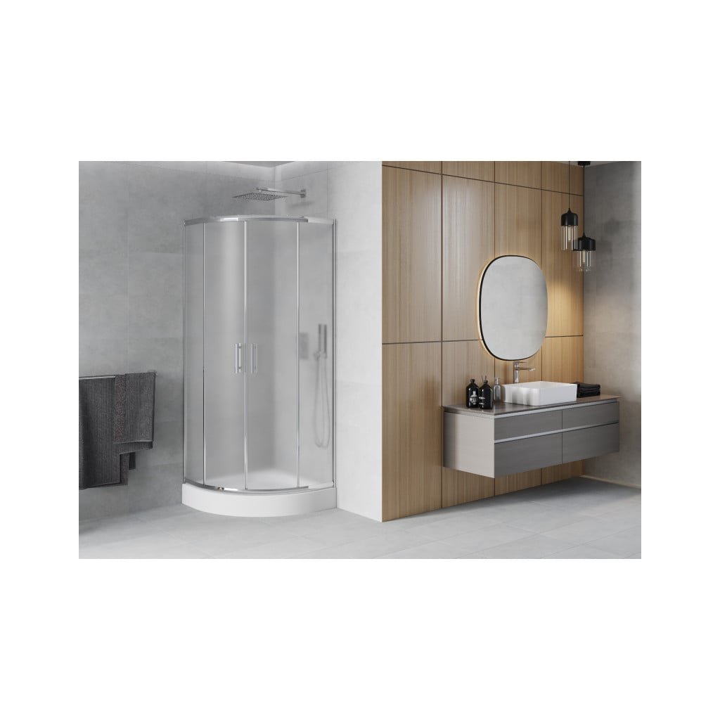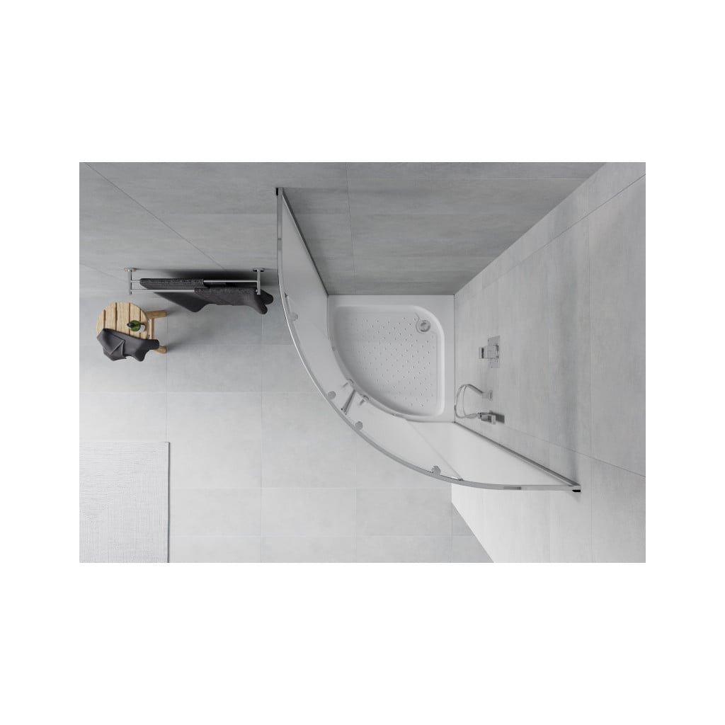 Mexen Rio, čtvrtkruhový sprchový kout s posuvnými dveřmi 90 x 90 cm + 5mm sklo námraza, chromový profil + bílá vysoká sprchová vanička Rio, 863-090-090-01-30-4710