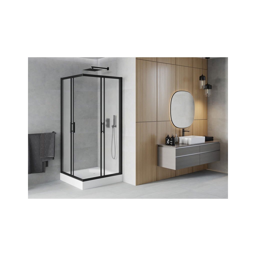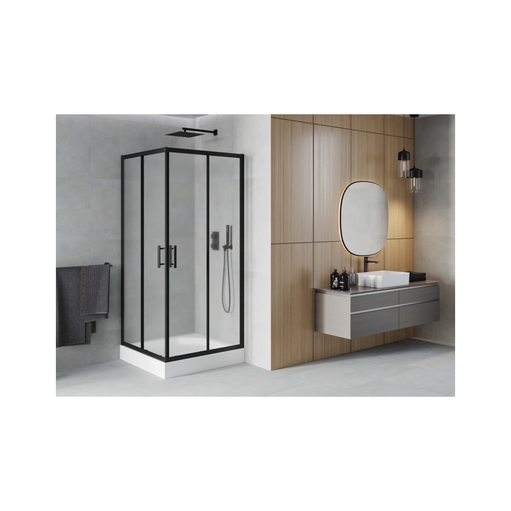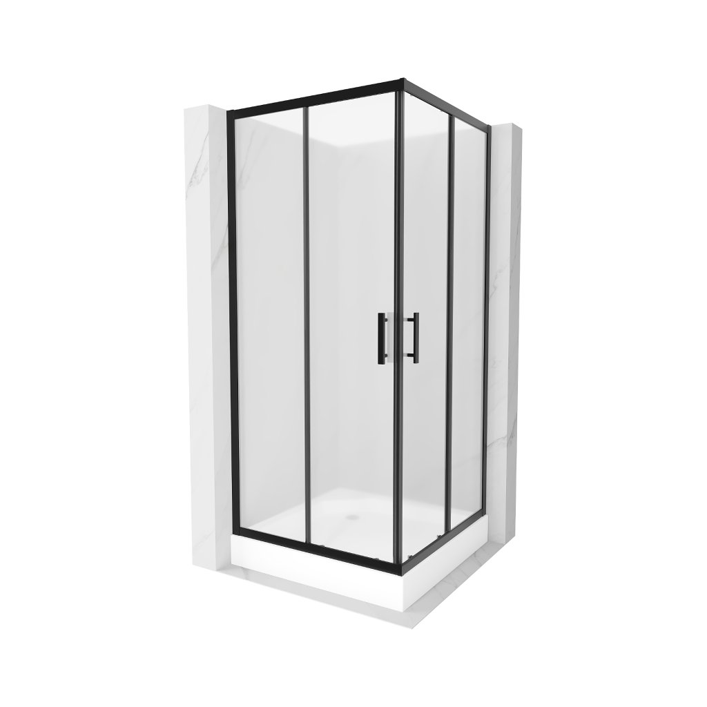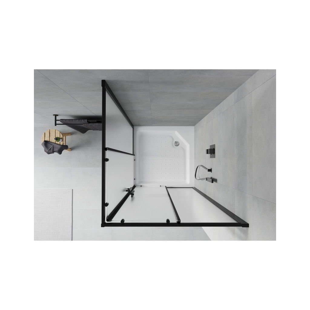 Mexen Rio, sprchový kout s posuvnými dveřmi 90x90x190 cm, 5mm sklo námraza, černý profil + bílá sprchová vanička RIO, 860-090-090-70-30-4510