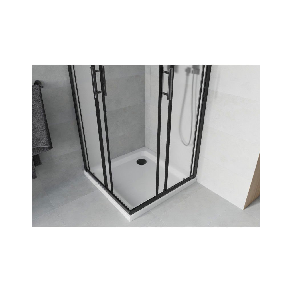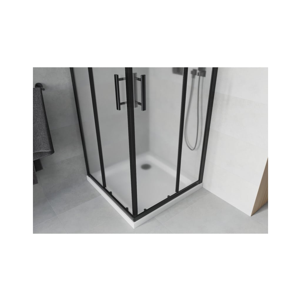 Mexen Rio, sprchový kout s posuvnými dveřmi 90x90x190 cm, 5mm sklo námraza, černý profil + bílá sprchová vanička SLIM, 860-090-090-70-30-4010B