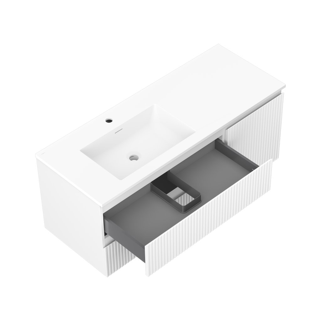 Mexen Rivel, koupelnová skříňka 120 cm s levým umyvadlem Otis, 2S, 1D, drážkovaná, bílá matná, 91A23-12047-3-BBFFF01-W18L01