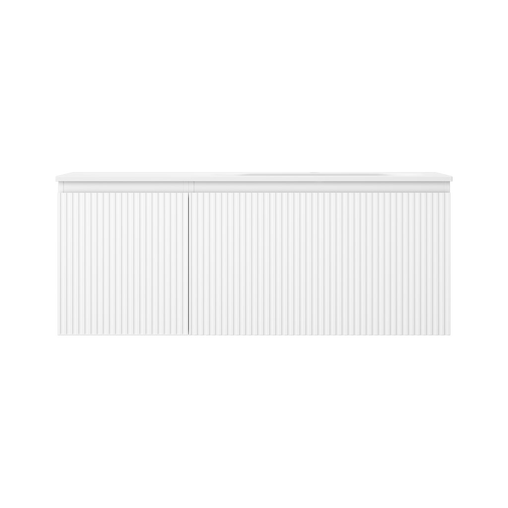 Mexen Rivel, koupelnová skříňka 120 cm s pravým umyvadlem Vela, 1S, 1D, drážkovaná, bílá matná, 91A23-12047-3-BBFF01-W23P01