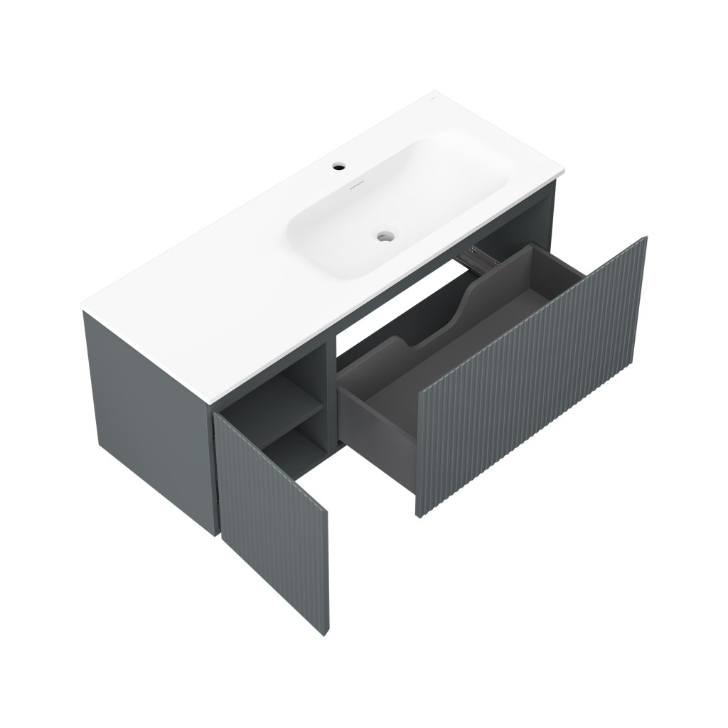 Mexen Rivel, koupelnová skříňka 120 cm s pravým umyvadlem Vela, 1S, 1D, drážkovaná, grafitová/bílá matná, 91A23-12047-3-BBFF66-W23P01