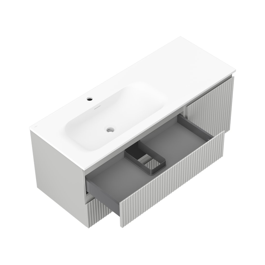 Mexen Rivel, koupelnová skříňka 120 cm s umyvadlem Vela vlevo, 2S, 1D, drážkovaná, šedá matná/bílá matná - 91A23-12047-3-BBFFF62-W23L01
