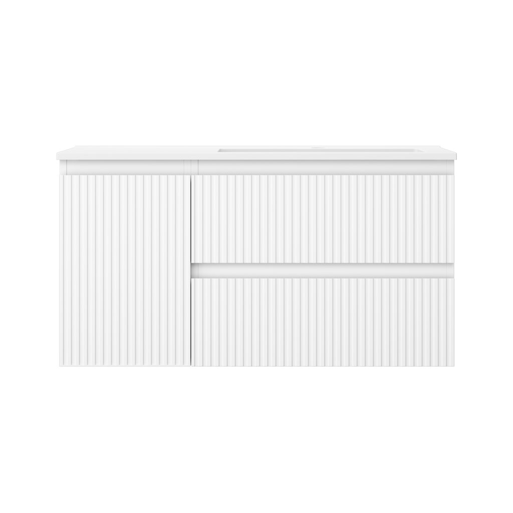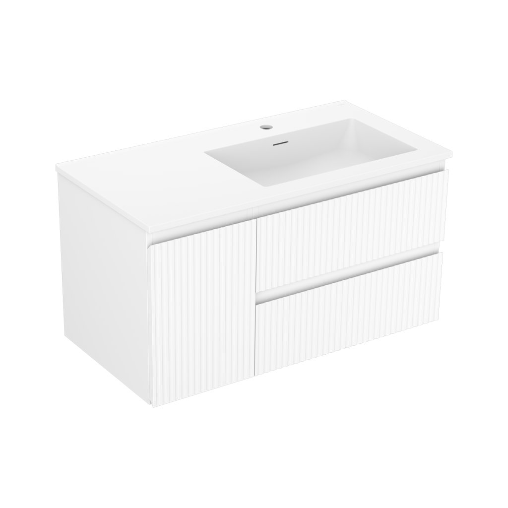 Mexen Rivel, koupelnová skříňka 90 cm s pravým umyvadlem Otis, 2S, 1D, drážkovaná, bílá matná, 91A23-09047-3-BBFFF01-W18P01