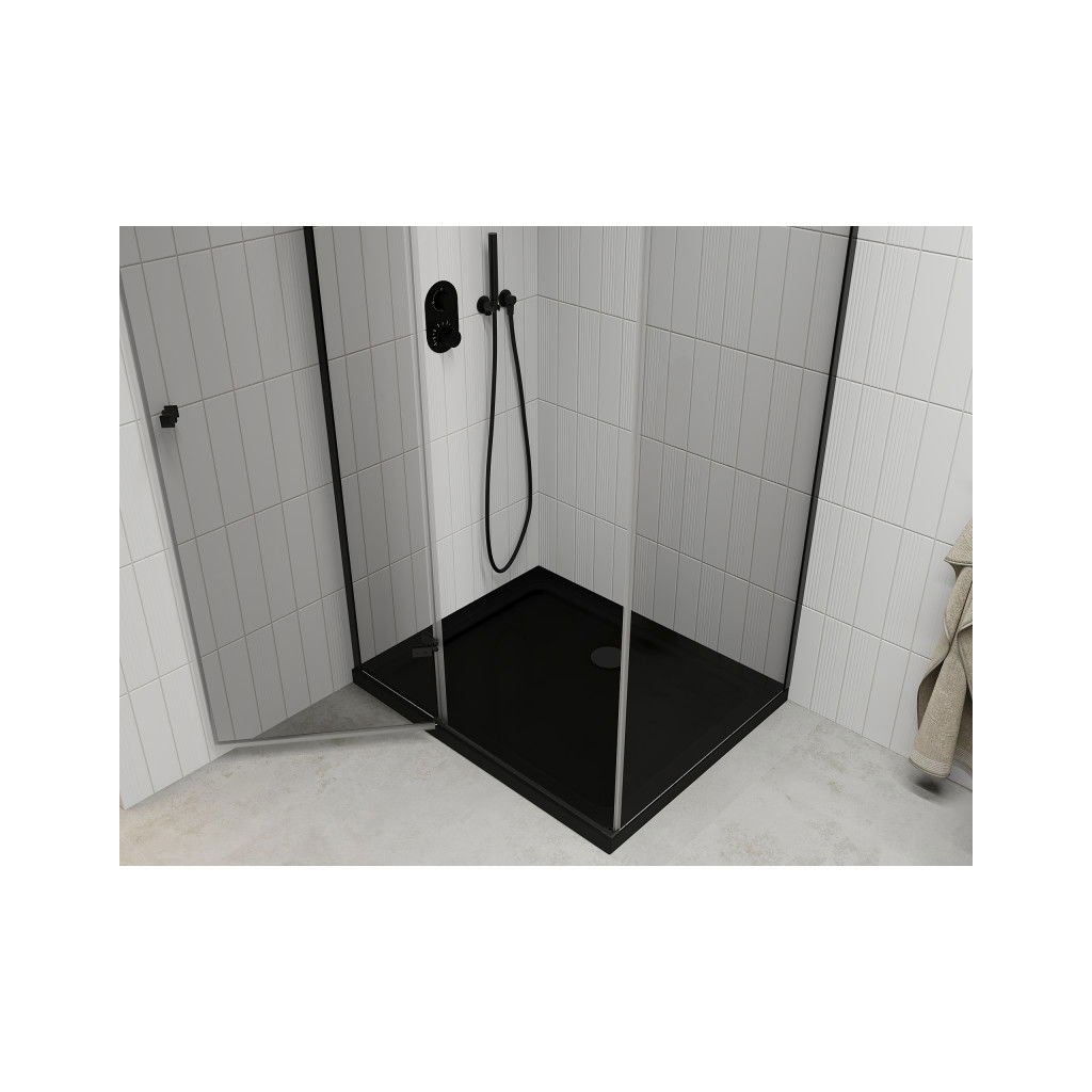 Mexen Roma, sprchový kout s 1-křídlými dveřmi 100 (dveře) x 90 (stěna) cm, 6mm čiré sklo, černý profil, slim sprchová vanička 5cm černá s černým sifonem, 854-100-090-70-00-4070B