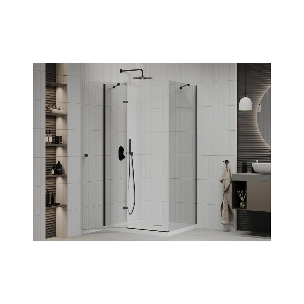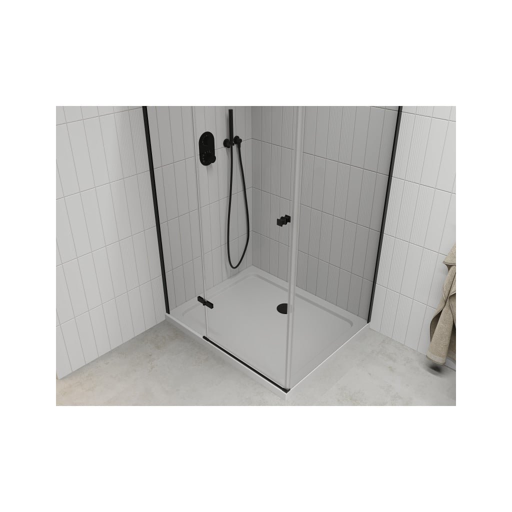 Mexen Roma, sprchový kout s 1-křídlými dveřmi 110 (dveře) x 90 (stěna) cm, 6mm čiré sklo, černý profil, slim sprchová vanička 5cm bílá s černým sifonem, 854-110-090-70-00-4010B