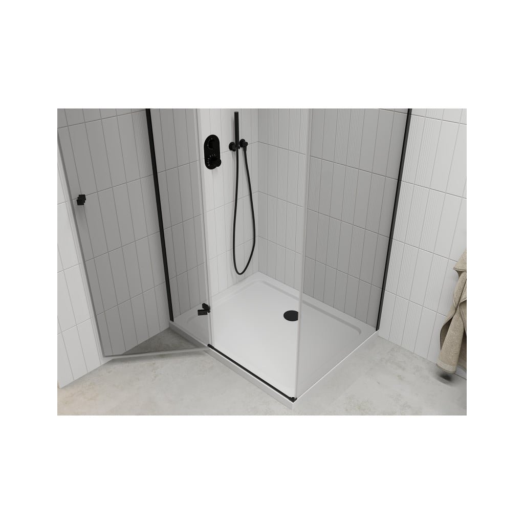 Mexen Roma, sprchový kout s 1-křídlými dveřmi 80 (dveře) x 110 (stěna) cm, 6mm čiré sklo, černý profil, slim sprchová vanička 5cm bílá s černým sifonem, 854-080-110-70-00-4010B
